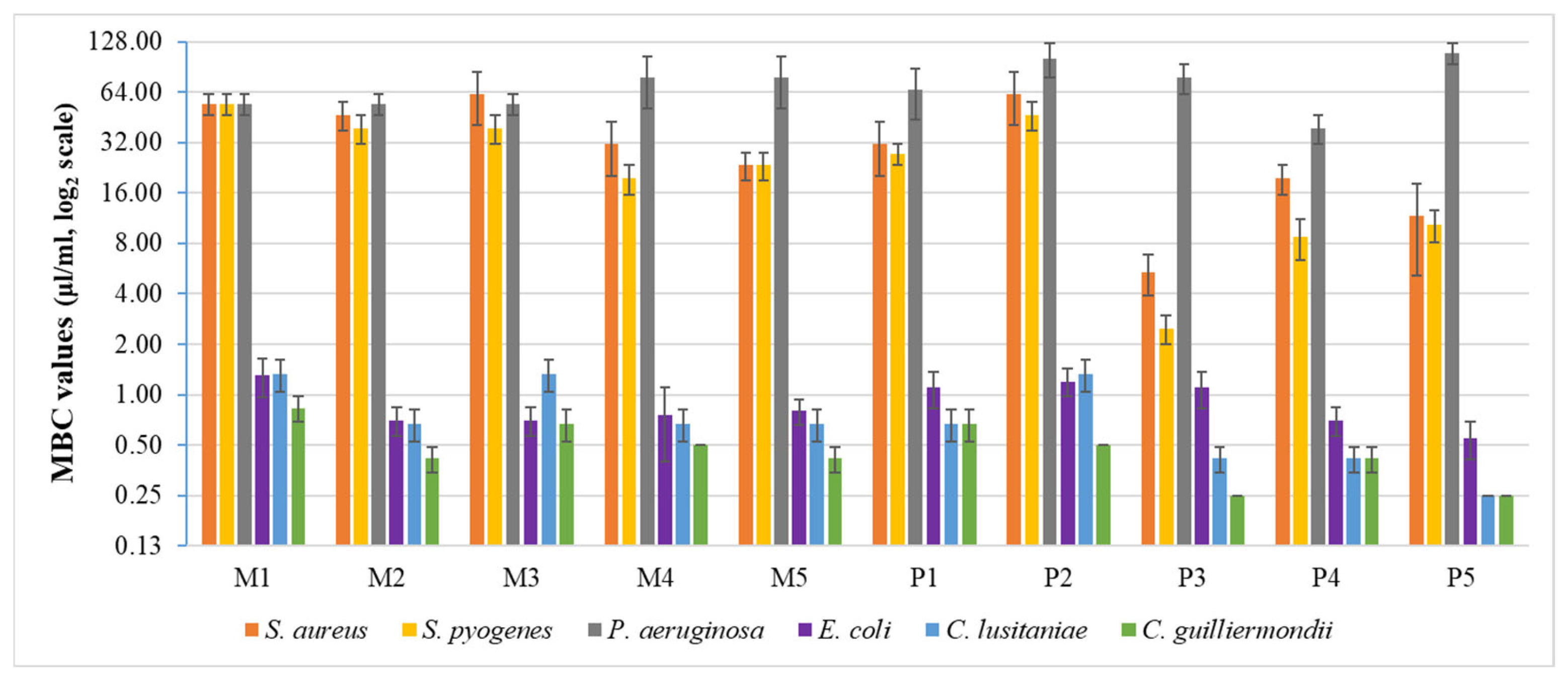 2.5. Determination of the Minimum Bactericidal Concentrations
