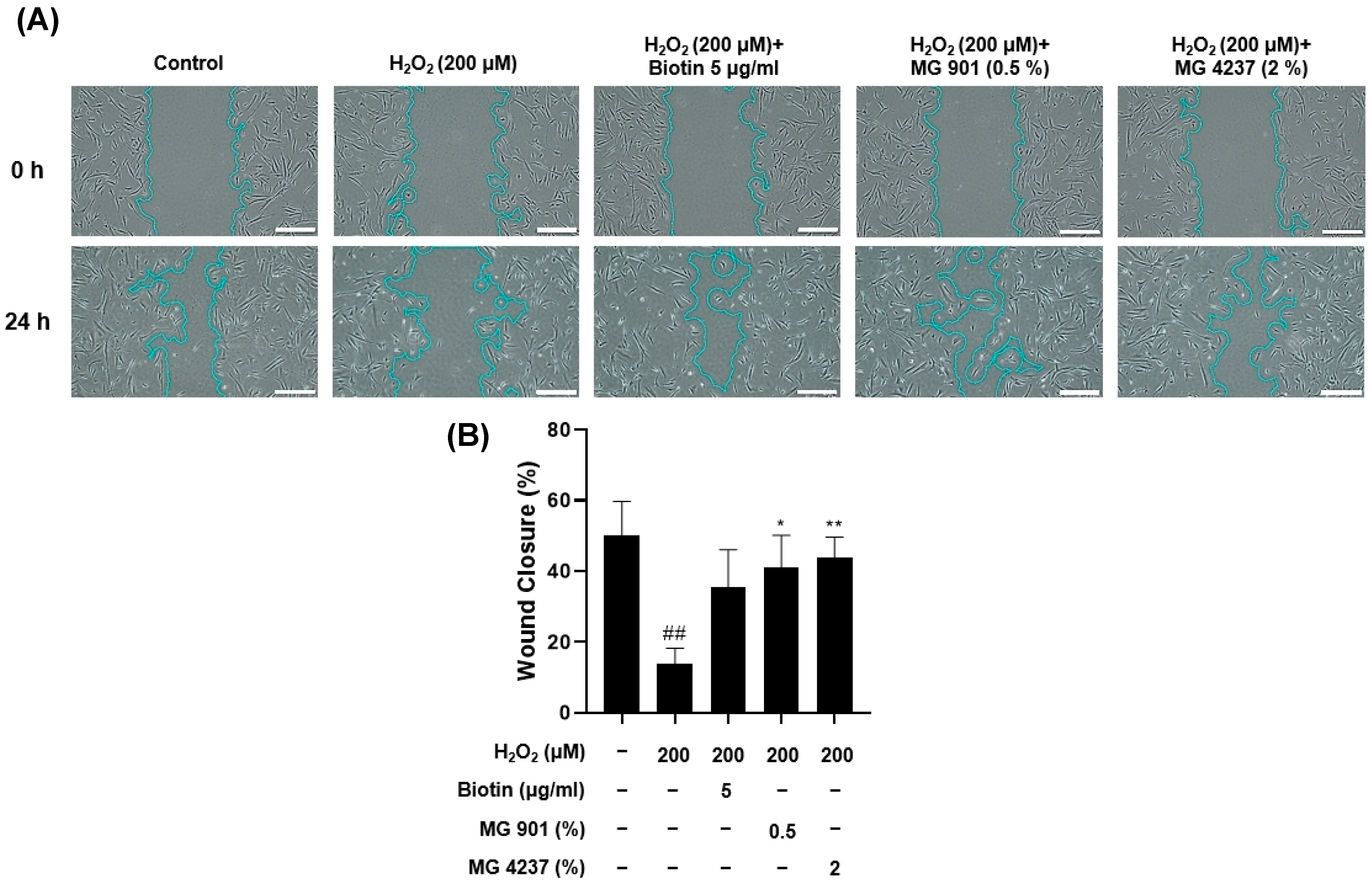 3.3. MG901- and MG4237-Derived CFS Enhanced Migration in H2O2-Damaged HFDPCs