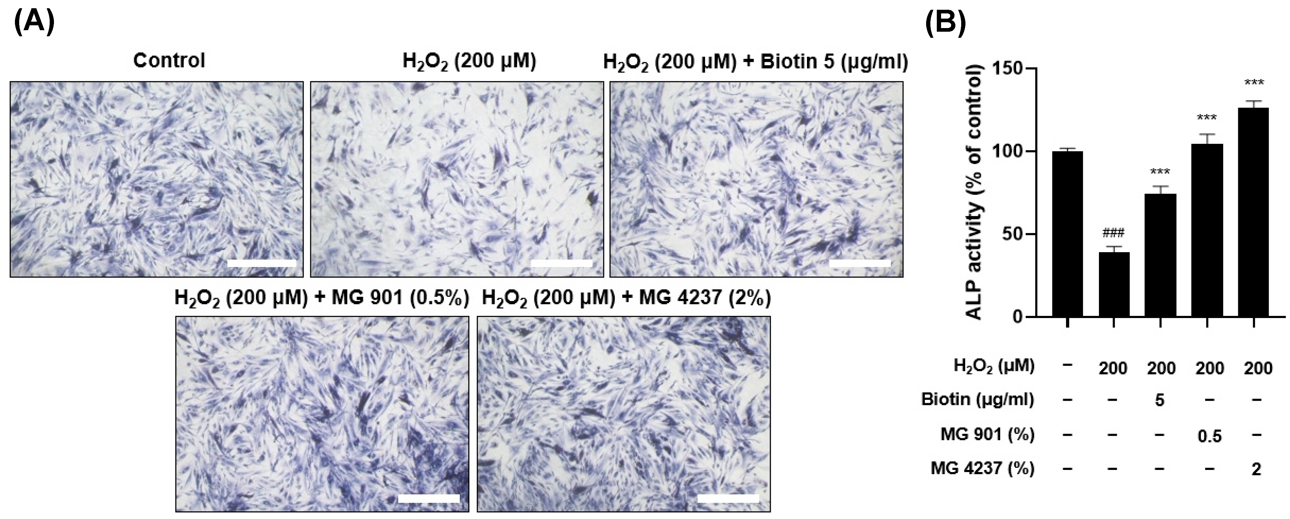 3.4. MG901- and MG4237-Derived CFS Modulated Alkaline Phosphatase Activity in H2O2-Damaged HFDPCs