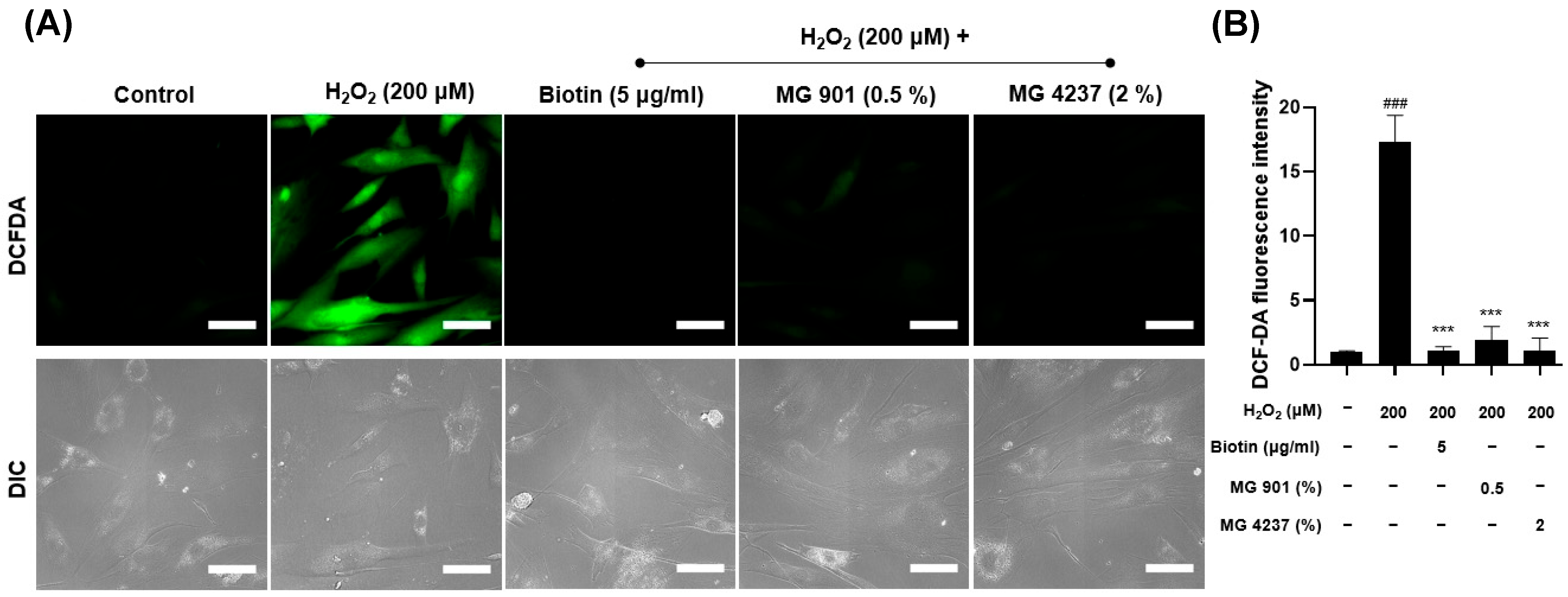3.5. MG901- and MG4237-Derived CFS Reduced Intracellular ROS Levels in H2O2-Damaged HFDPCs