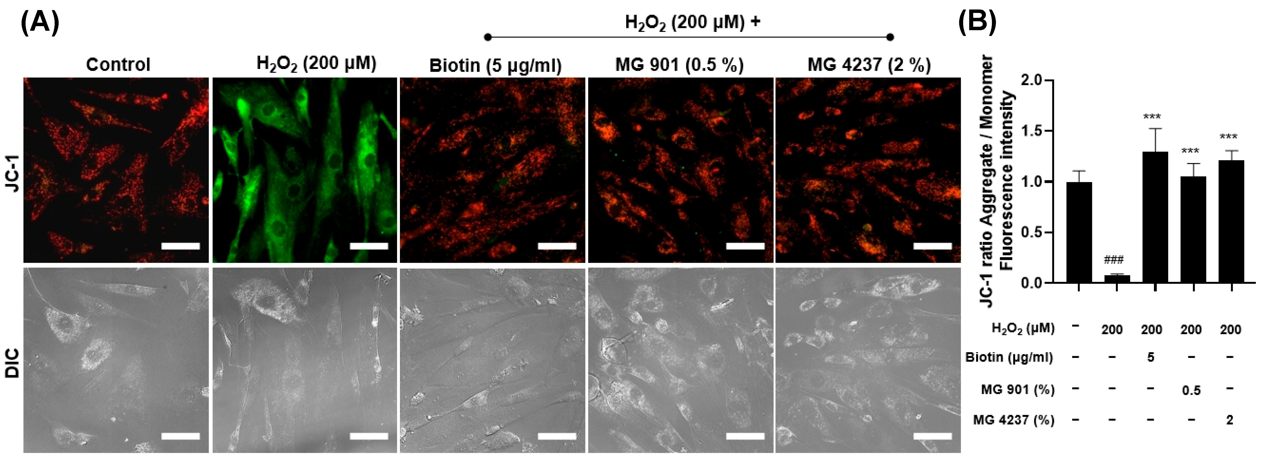 3.6. MG901 and MG4237 Modulated Mitochondrial Membrane Potential in H2O2-Damaged HFDPCs