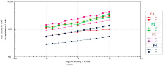 The frequency sweep test was used to characterize the viscoelastic behavior of the samples as a function of angular frequency. The test was performed in a range from 10 to 0.1 rad/s. For each formulation, the strain amplitude used in the frequency sweep test was selected individually based on the previously determined LVER from the amplitude sweep. Specifically, the following strain values were applied: F1: 0.10%, F2: 0.03%, F3: 0.05%, and F4: 0.08%. The test was conducted with a logarithmic distribution across 11 points, and the following parameters were monitored: Storage Modulus (G′) and Loss Modulus (G″) as a function of frequency. Loss Factor (tan δ): calculated as the ratio G″/G′, serving as an indicator of the dominant type of behavior (solid/elastic when tan δ < 1, or liquid/viscous when tan δ > 1) [26,27].