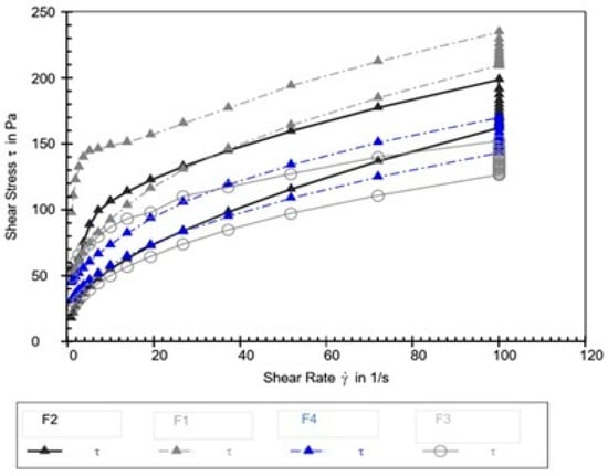 All formulations displayed a slight increase in viscosity within the first two to three measurement points, followed by a typical shear-thinning profile. This initial rise is likely associated with structural rearrangements upon transition from rest to flow [35]. Due to the absence of a well-defined Newtonian plateau at very low shear rates, η0 values estimated by the Cross model were not considered reliable, particularly for F1 and F3. Consequently, the viscosity measured experimentally at 0.001 s−1 was used as a more robust indicator of low-shear behavior.