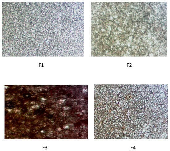 The microstructure of the emulsion formulations (F1–F4) was examined using an optical microscope equipped with a digital camera. A small amount of each sample was applied to a glass slide to form a thin layer of emulsion cream and covered with a cover glass. Images were taken at a total magnification of 400× under bright field. For each formulation, three independent images were taken from different parts of the sample to ensure representativeness.