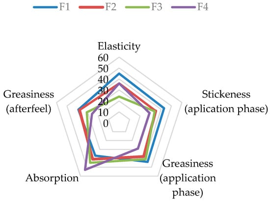 Radar chart illustrating the rank sums of sensory attributes with significant differences for cream formulations F1–F4. (Note: For Stickiness and Greasiness, a lower rank sum is desirable, indicating less intensity. For Absorption and Elasticity, a higher rank sum is desirable.