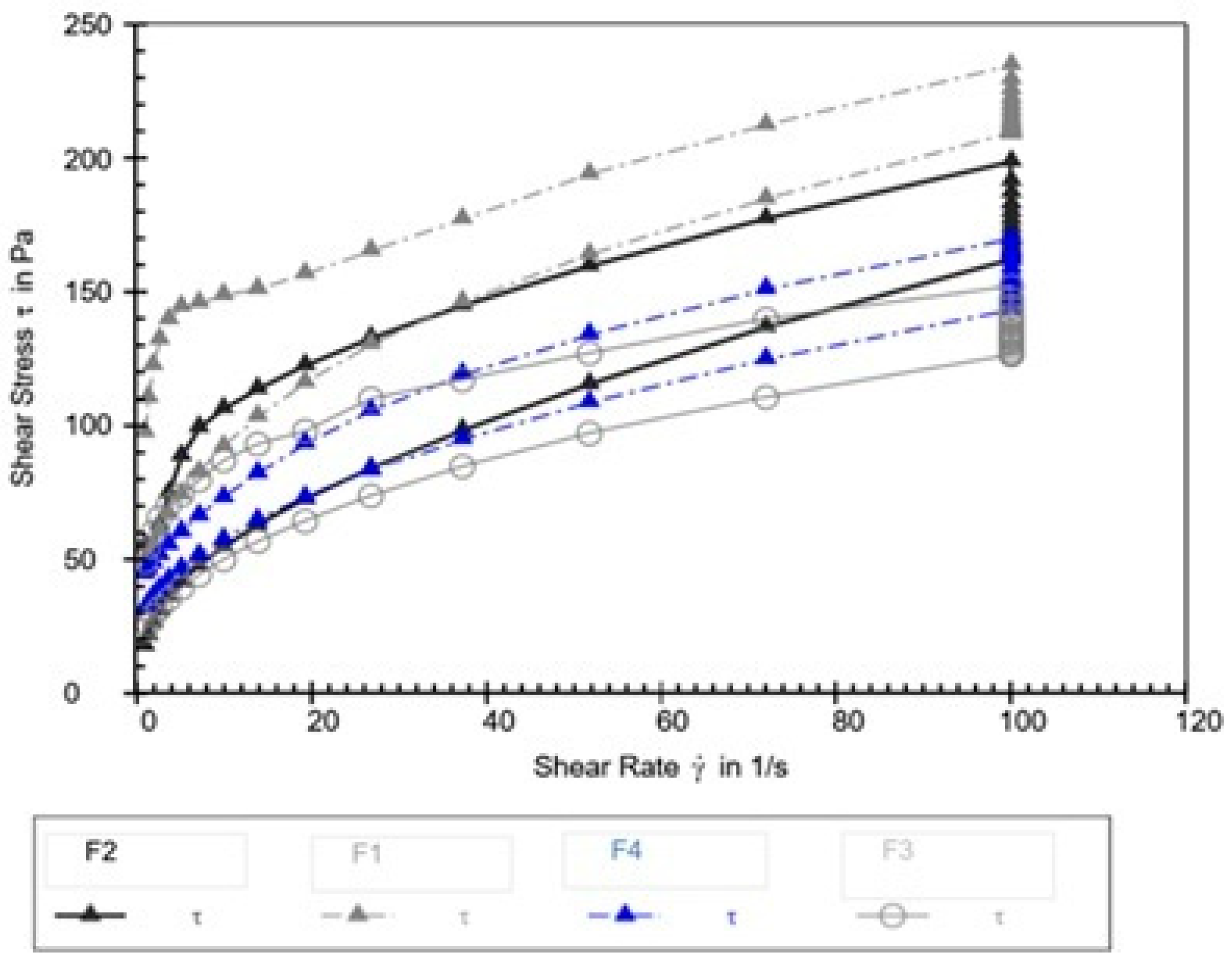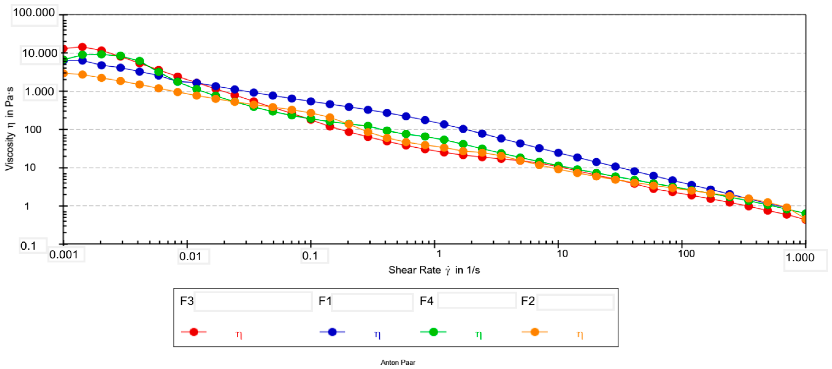 | Viscosity (η) [Pa*s] 0.001 1/s | Zero-Shear Viscosity (η0) [Pa*s] | Infinite-Shear Viscosity (η∞) [Pa*s] | Consistency Index K (Pa s) | Fluidity Index n | Correlation coefficient R2 | |