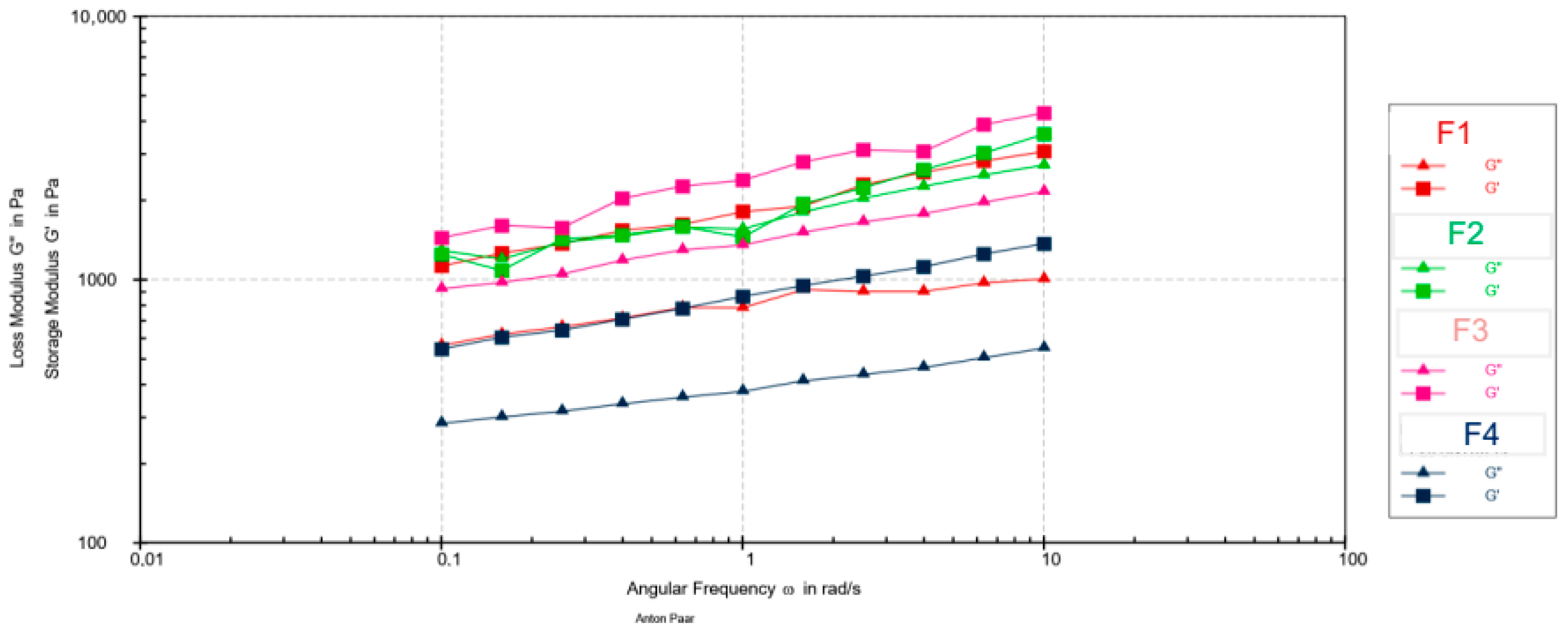 | Structural behavior during application | G′ G″ (frequency sweep) | F3 | The highest oscillatory G′ reflects the stiffest internal network under dynamic deformation. | Relates to resistance to collapse during manipulation. |