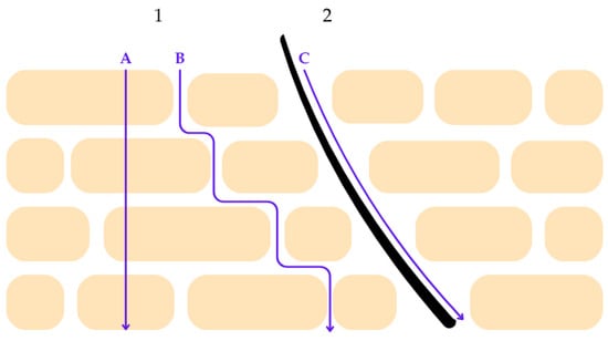 Schematic representation of percutaneous penetration pathways across the stratum corneum. Route 1 illustrates transepidermal penetration, which comprises two distinct mechanisms: (A) the transcellular pathway, in which molecules diffuse directly through corneocytes, and (B) the intercellular pathway, characterized by diffusion along the lamellar lipid matrix between corneocytes. These pathways are primarily influenced by the physicochemical properties of the penetrant, including molecular size, polarity, and lipophilicity, as well as the structural organization of stratum corneum lipids. Route 2 represents the transappendageal pathway (C), whereby penetration occurs via skin appendages such as hair follicles and sweat ducts. Although this pathway contributes less to overall surface area penetration, it may play a significant role in the delivery of certain actives, particularly in compromised or inflamed skin. The figure highlights the complexity of cutaneous penetration mechanisms relevant to the design of dermocosmetic delivery systems. Reprinted from Ref. [68] (MDPI open access under the terms of the CC-BY license).