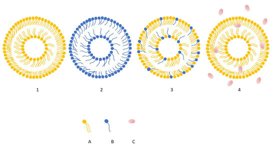 Schematic illustration showing structural differences among liposomes (1), niosomes (2), transferosomes (3), ethosomes (4). Element (A) represent phospholipids, whereas (B) surfactants, (C) ethanol, predominantly present in the surrounding hydroalcoholic phase. For clarity and schematic simplicity, cholesterol has been omitted from the illustration [own work].