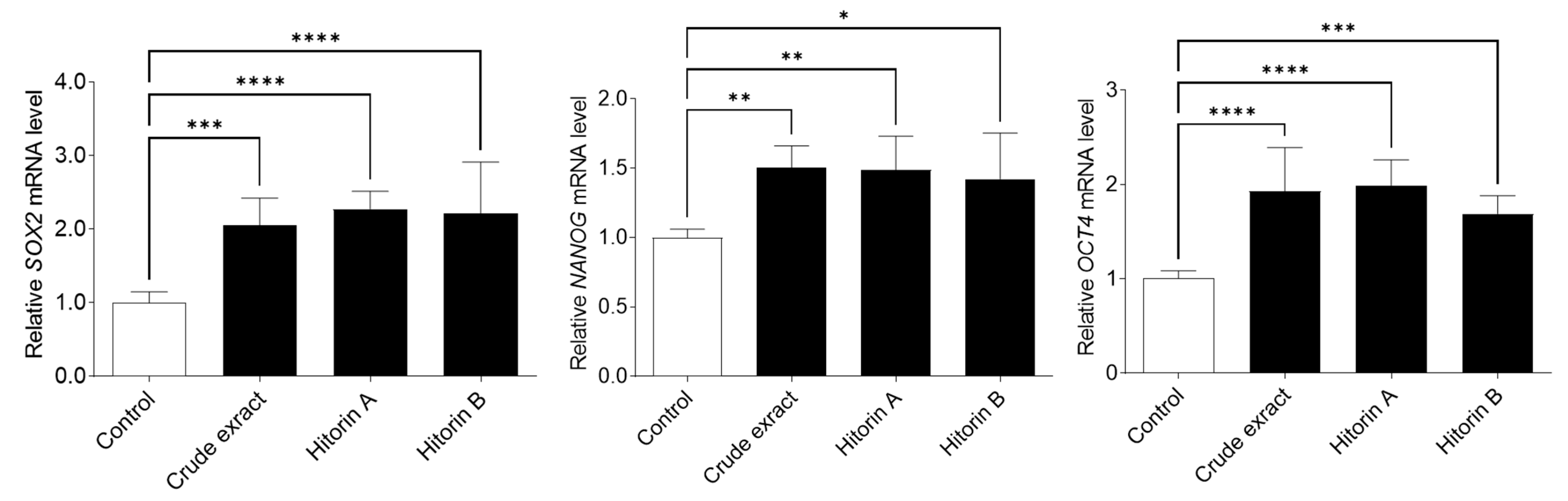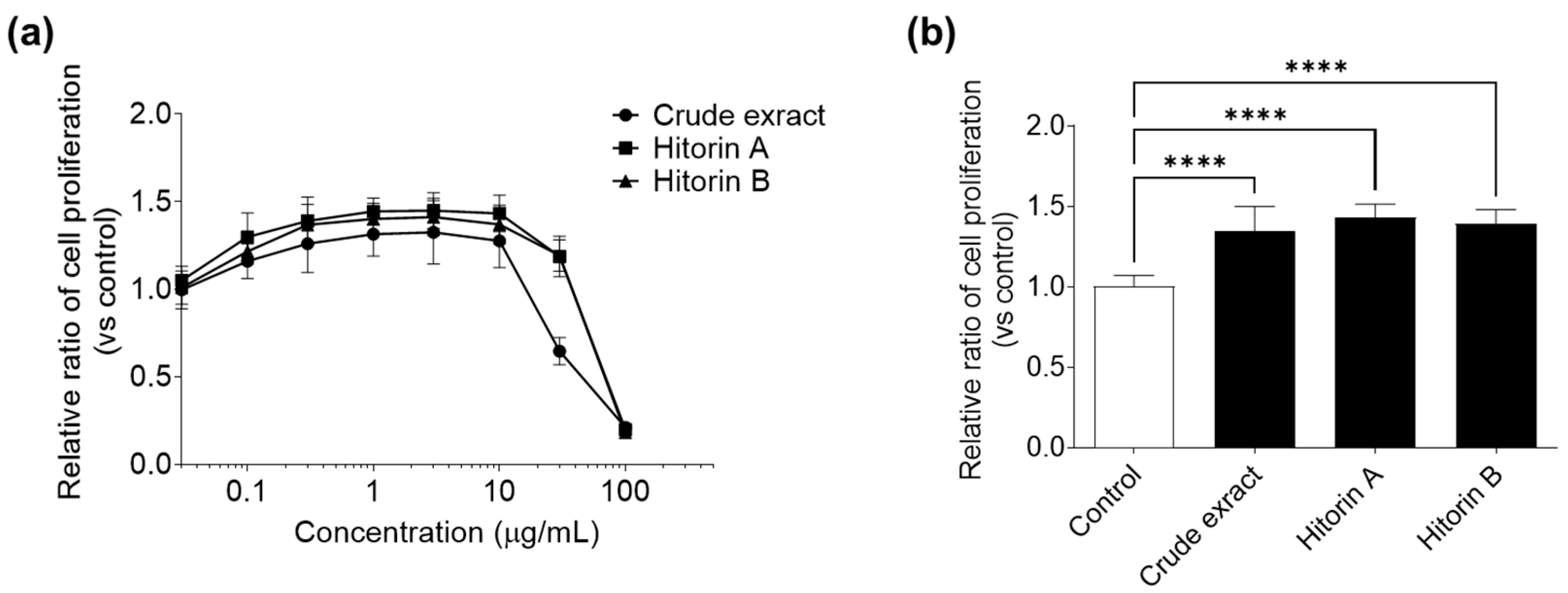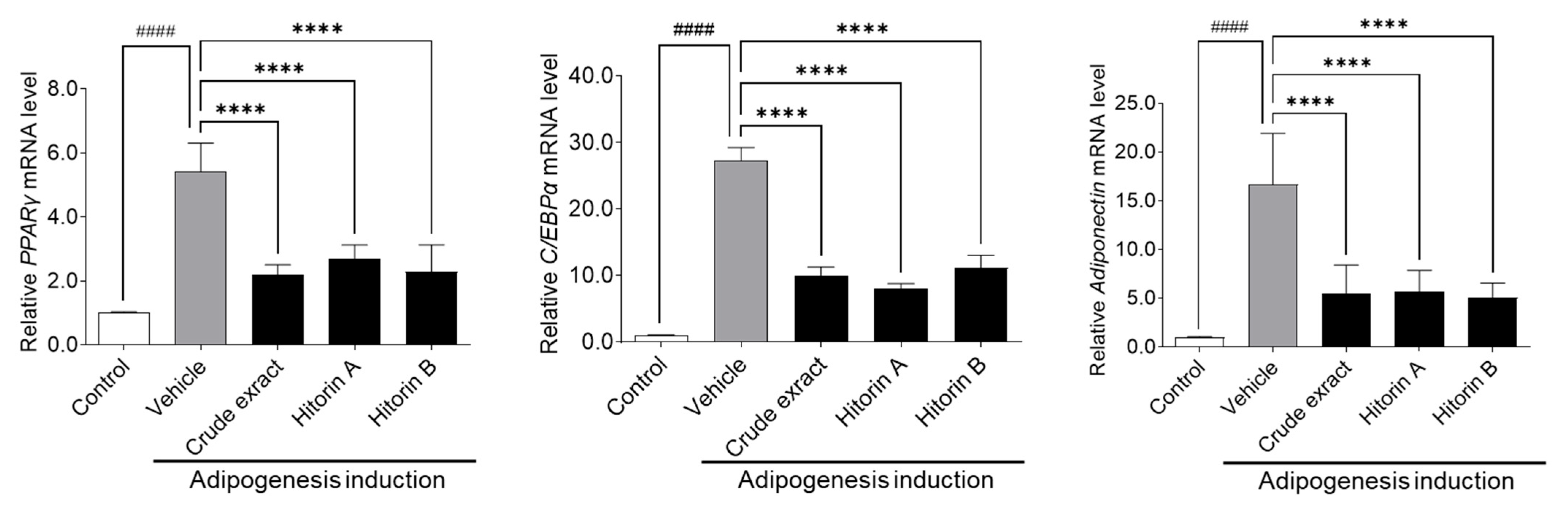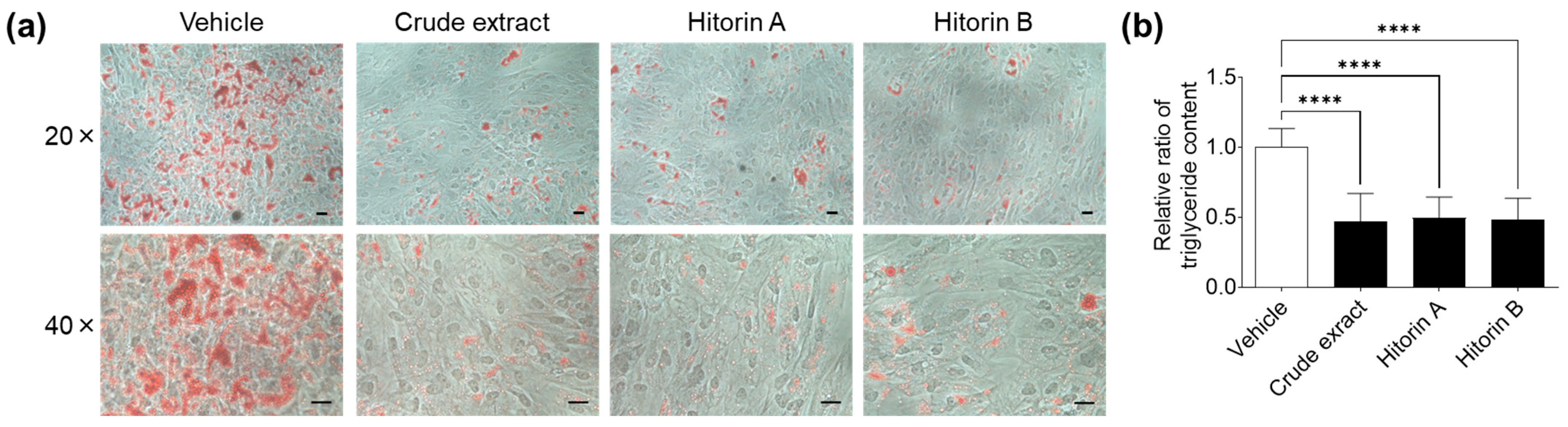 3.1. Crude Extract and Hitorins A and B from C. quadrifolius Inhibit Excessive Adipocyte Differentiation and Promote AD-MSCs Proliferation