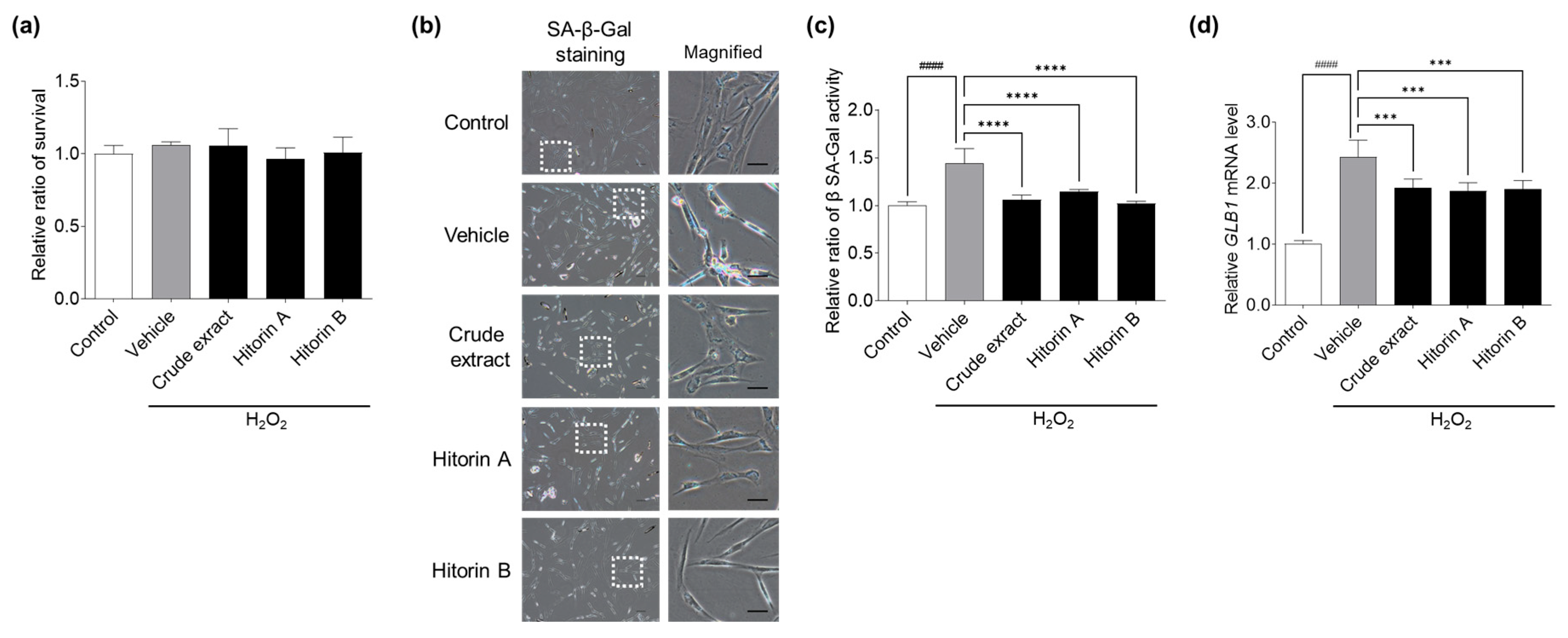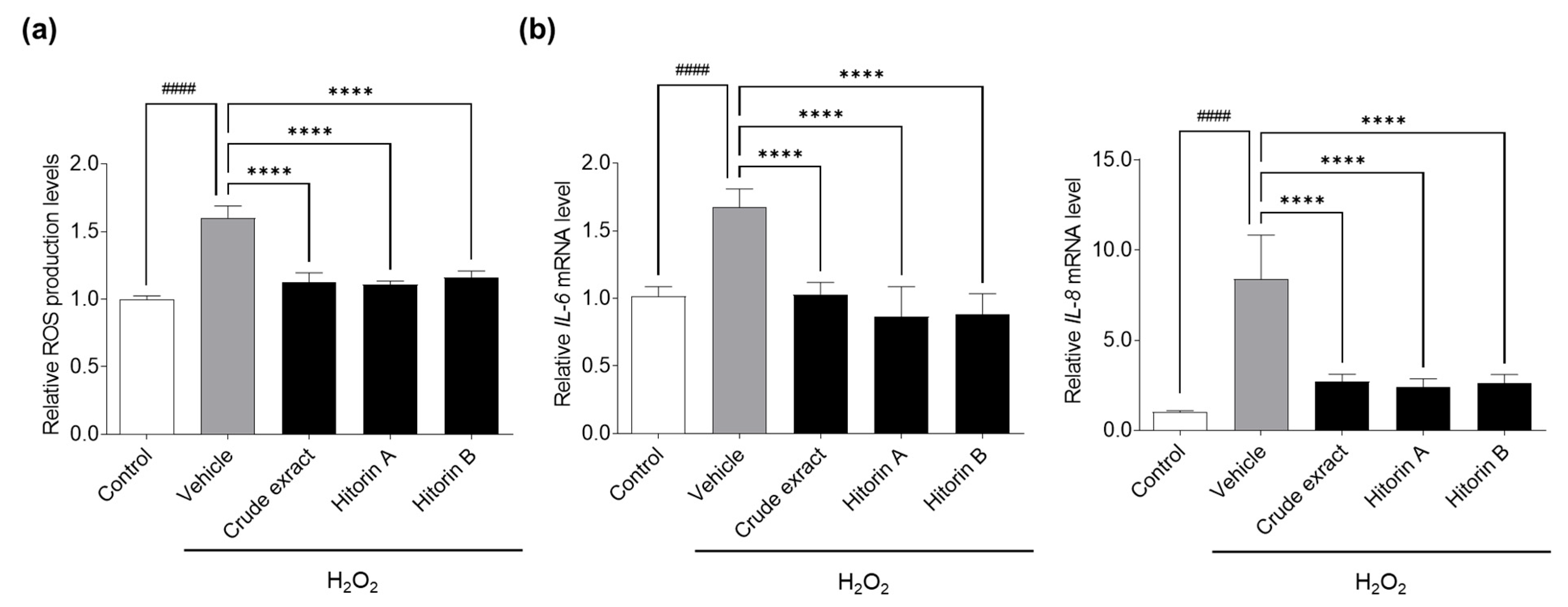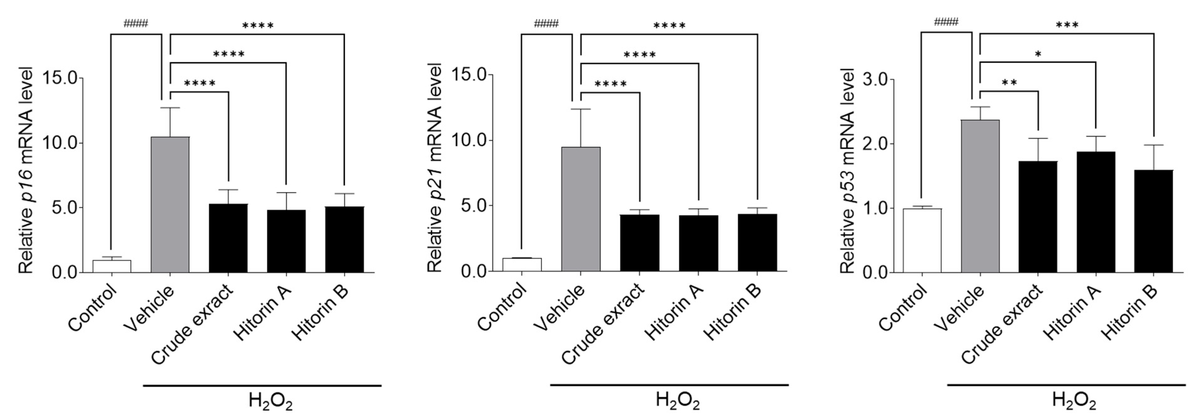 3.2. Crude Extract and Hitorins A and B from C. quadrifolius Inhibit Cellular Senescence in AD-MSCs Through Antioxidative and Anti-Inflammatory Activities