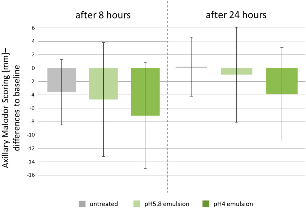 The present study revealed that a W/O emulsion with pH 4 is effective in reducing body odor significantly whereas the W/O emulsion with pH 5.8 was not effective compared to untreated control. Moreover, the application of the pH 4.0 emulsion resulted in numerically lower malodor scores at 8 and even after 24 h following the last treatment application, compared to the pH 5.8 emulsion. However, pH 5.8 emulsion had also significantly lower axillary malodor scores after 8 h, but this may be depend on the properties of the W/O emulsion alone. The differences in malodor scores between treatments just narrowly missed statistical significance.