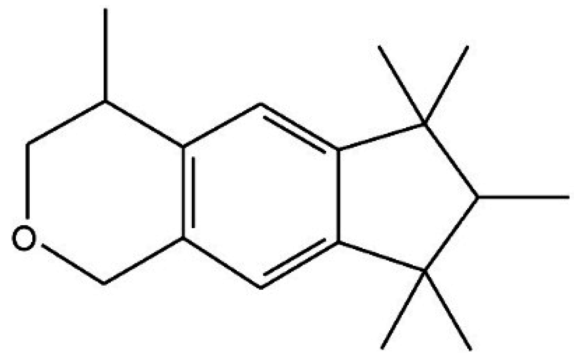 - Correia, P.; Cruz, A.; Santos, L.; Alves, A. Human dermal exposure to galaxolide from personal care products. Int. J. Cosmet. Sci. 2013, 35, 299–309. [Google Scholar] [CrossRef] [PubMed]