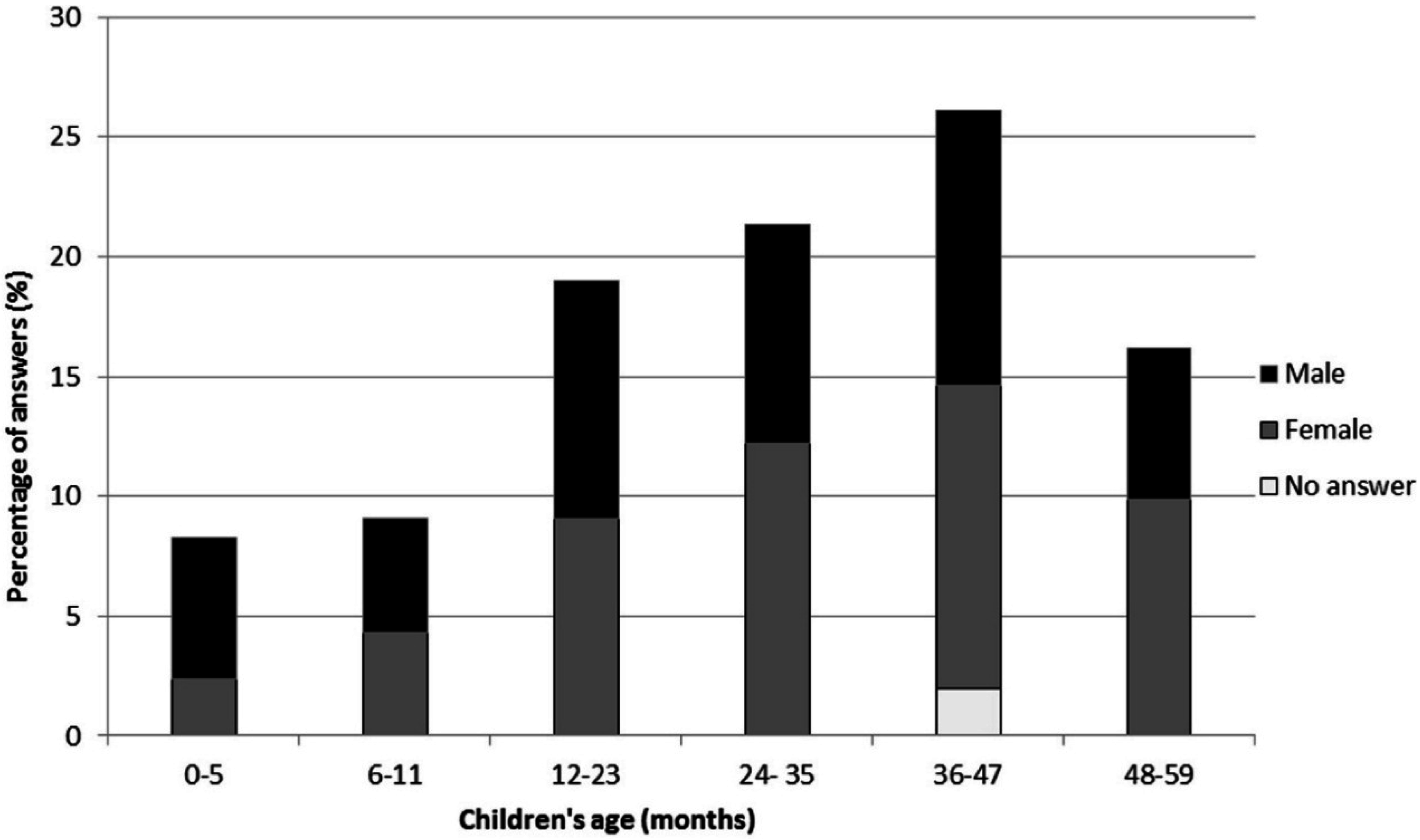 Children’s ages were selected assuming a previous reported range [9]. The children were divided into six age categories corresponding to each year of life, except for the first year, where the range was two half years. This was done because, during the first year, children experience exponential growth and major modifications on their skin structure, mainly during the first half year [7,9]. They were aged 0–5 months (8.3%), 6–11 months (9.1%), 12–23 months (19.0%), 24–35 months (21.3%), 36–47 months (26.1%), and 48–59 months (16.2%). The distribution of the six age groups by gender is shown in Figure 2, where 51% belongs to the female and 47% to the male gender. This distribution is according to Portugal Census 2011 [19] for the Oporto district: 52% female and 48% male.