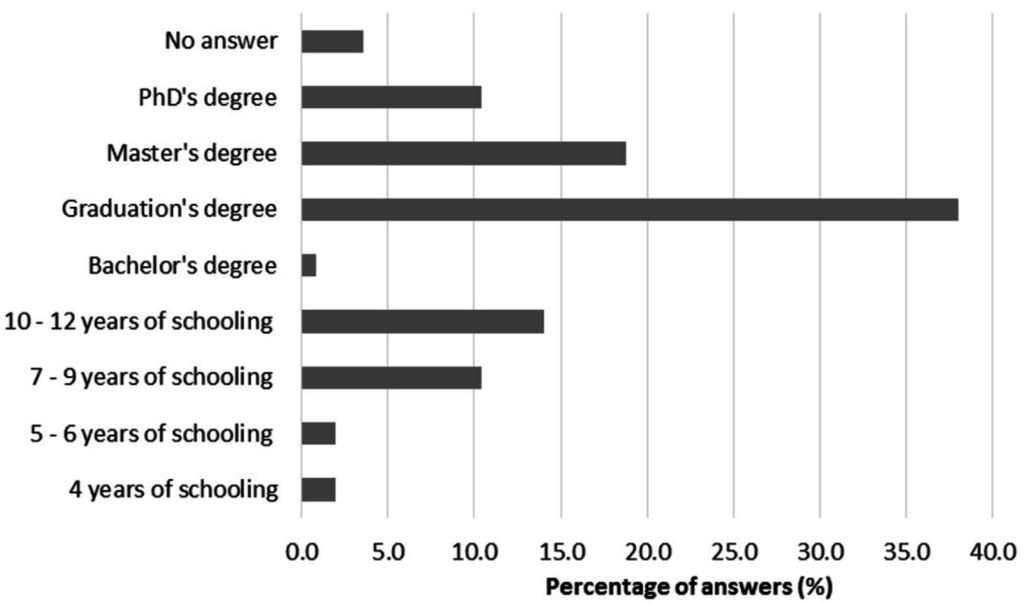 Most questionnaires (89.2%) were answered by the children’s mothers, 8.8% by the fathers, and 2.0% did not answer to this question. The caregivers, with an average of 34.7 ± 4.3 years, are mostly in charge with only one child under five years old (79.2%) and have an undergraduate degree (38.0%) or a Master’s degree (18.8%), and few (4.0%) have less than six years of schooling (Figure 3).