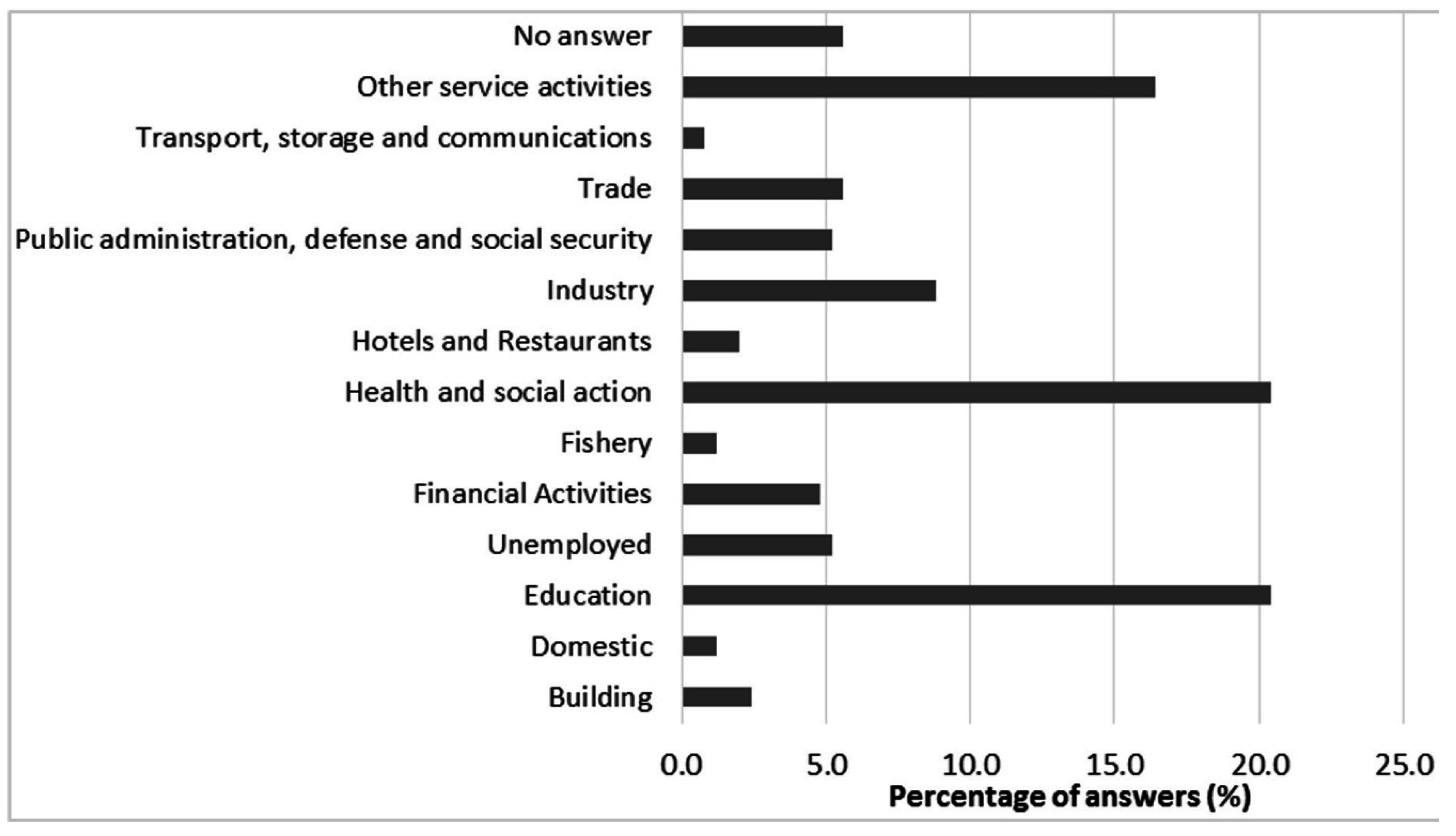 In terms of professional occupation, 20.4% of caregivers work both in the area of “Education” as in “Health and social work”, 16.4% in “Other service activities”, and 8.8% in the “Industry”, but 5.2% are “Unemployed” (Figure 4). Families are mainly comprised of three (45.0%) or four members (44.0%) and most of them (53.6%) reported a monthly income equal or superior to three minimum wages, while for 6.4%, monthly income was equal to the minimum wage (about 466 euros/month at the time of the study). Nevertheless, 9.2% of the respondents have chosen not to answer to this question.