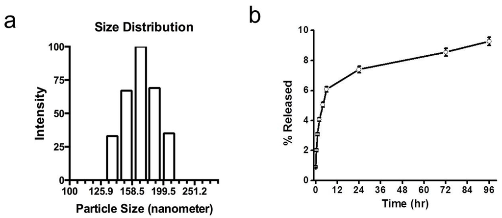 Characterization of near-infrared dye-loaded nanoparticles. (a) Gaussian distribution of nanoparticles. Nanoparticles had a mean hydrodynamic diameter of 165 nm with a polydispersity index of 0.135. (b) Dye release from nanoparticles in buffer under in vitro conditions. Nanoparticles in release buffer released less than 10% of their total incorporated dye in 96 h. Data show mean ± standard error, with n = 3.