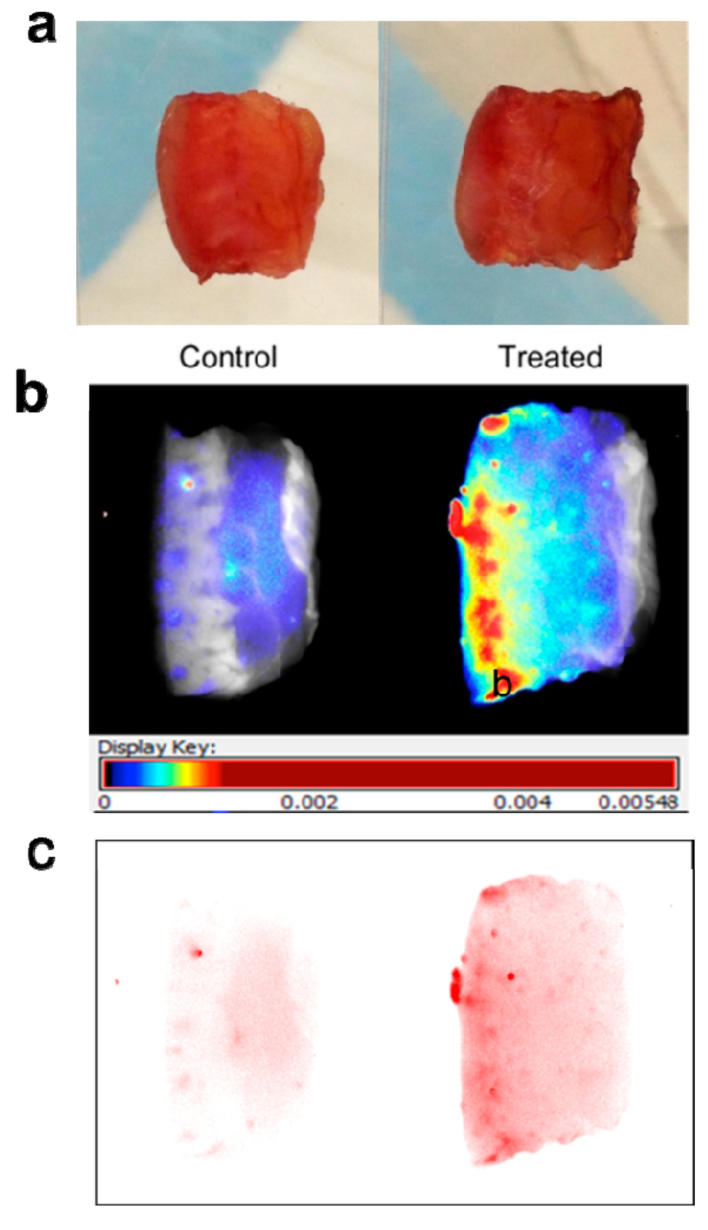 Maestro images were taken of specimen pairs mounted between glass slides (Figure 2a). Fluorescence signal was visualized in two ways: first, translated to heat maps (Figure 2b), with warm colors representing high fluorescence signal and cool colors representing low fluorescence signal), and second, with near-infrared signal shown as a single color (red) of varying intensity (Figure 2c). Both demonstrate clear diffusion of near-infrared signal through the treated specimen.