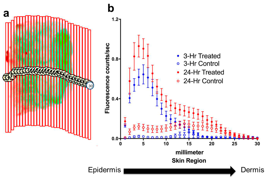 To determine the depth of penetration by dye-containing nanoparticles into the skin, the fluorescence signal of the near-infrared dye was quantified both in total for each specimen and for each of thirty 0.5 mm-wide, vertical regions spanning the cross-section of the specimen (Figure 3a). The digital sectioning data for each incubation group were compiled, and corresponding control measurements were subtracted from treated specimen measurements, to chart average signal diffusion through these specimens for each incubation time group (Figure 3b). The fluorescence signal in treated specimens was at a peak on the surface of the skin, where some residue of cream and nanoparticles will remain even after the cream has been manually removed. The signal also shows the penetration of nanoparticles through the skin layers, with an almost exponential decrease in signal intensity with the depth of the skin. The control specimens where only cream was applied displayed insignificant signal throughout the skin layers, indicating that there is no near-infrared background signal from the cream or from the skin itself.