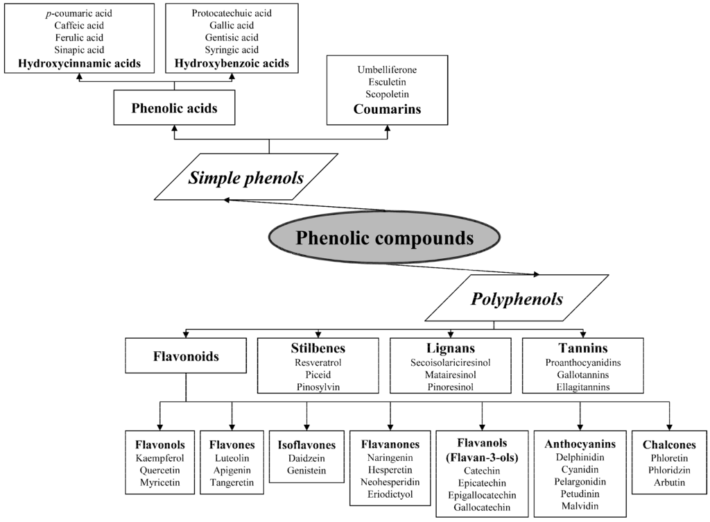 - Flavonoids are the largest group of plant phenols and the most studied. The structure consists of 15 carbon atoms (C6–C3–C6). The aromatic ring A is derived from the acetate/malonate pathway, and ring B is derived from phenylalanine through the shikimate pathway [17]. Variations in substitution patterns to ring C (oxygenation, alkylation, glycosylation, acylation or sulfation) result in 13 flavonoid classes, being the most important flavonols, flavones, isoflavones, flavanones, flavanols (also called flavan-3-ols) and anthocyanidins or anthocyanins [18]. The chalcones are intermediate in the biosynthesis of flavonoids.