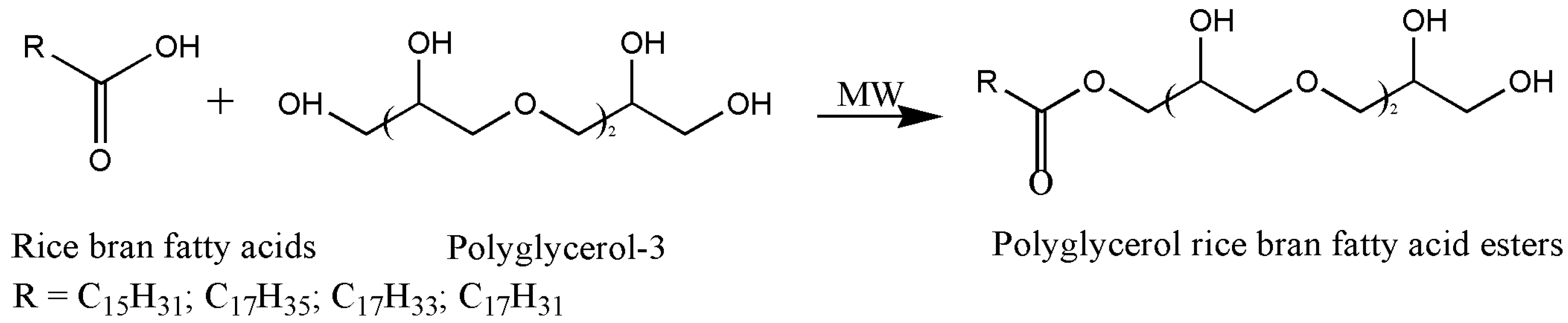 2.2.1. Synthesis of Polyglycerol Rice Bran Fatty Acid Esters