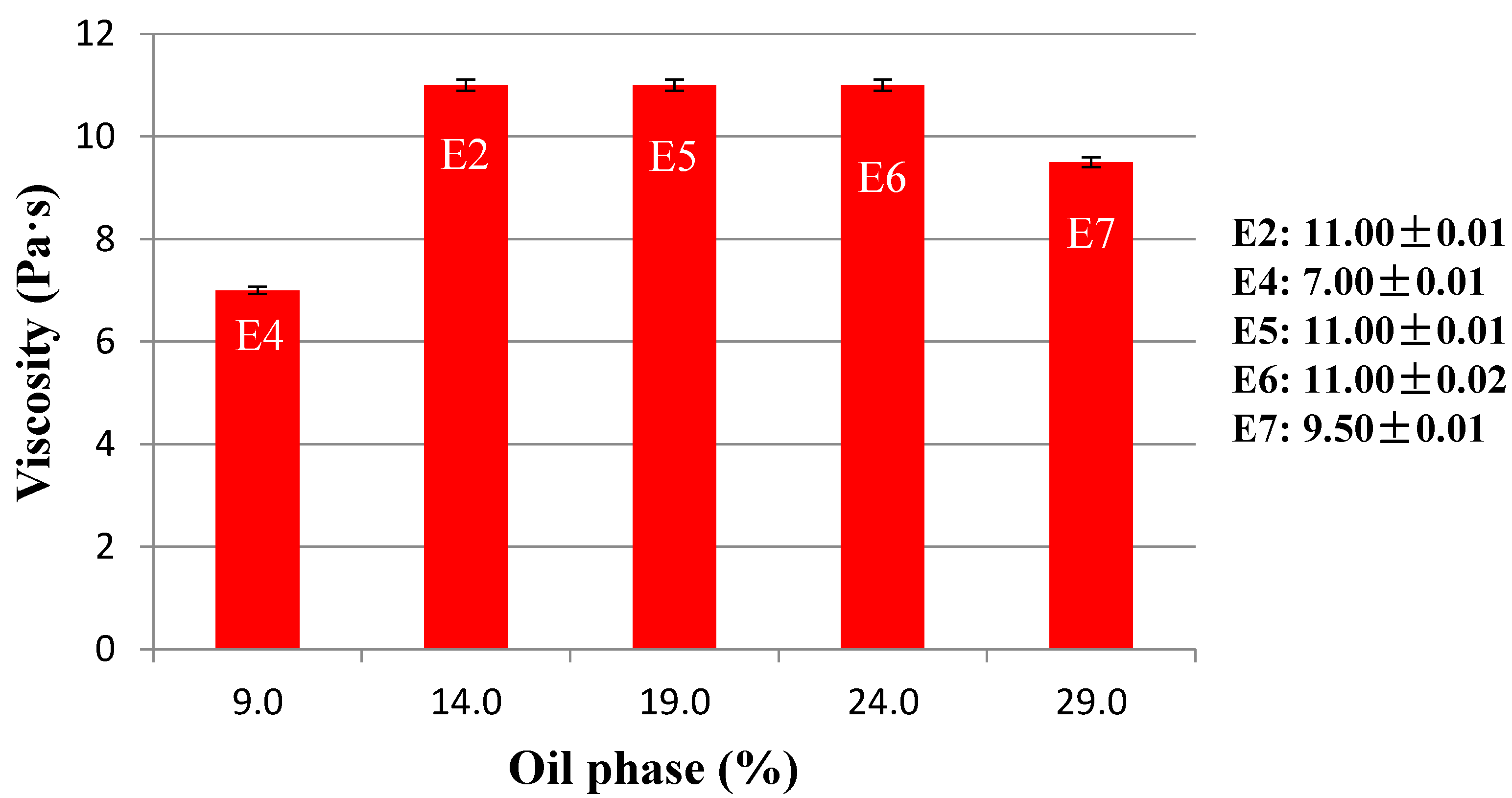 Table 2). All these emulsions have passed the test of stability showing that variable amounts of oils could be emulsified from 9% to 29%. The formulations containing 14% (E2) and 19% (E5) of the oil phase showed the best organoleptic characteristics (white color, polished appearance, and good texture). The amount of oil phase affects the viscosity of the emulsion, as shown in