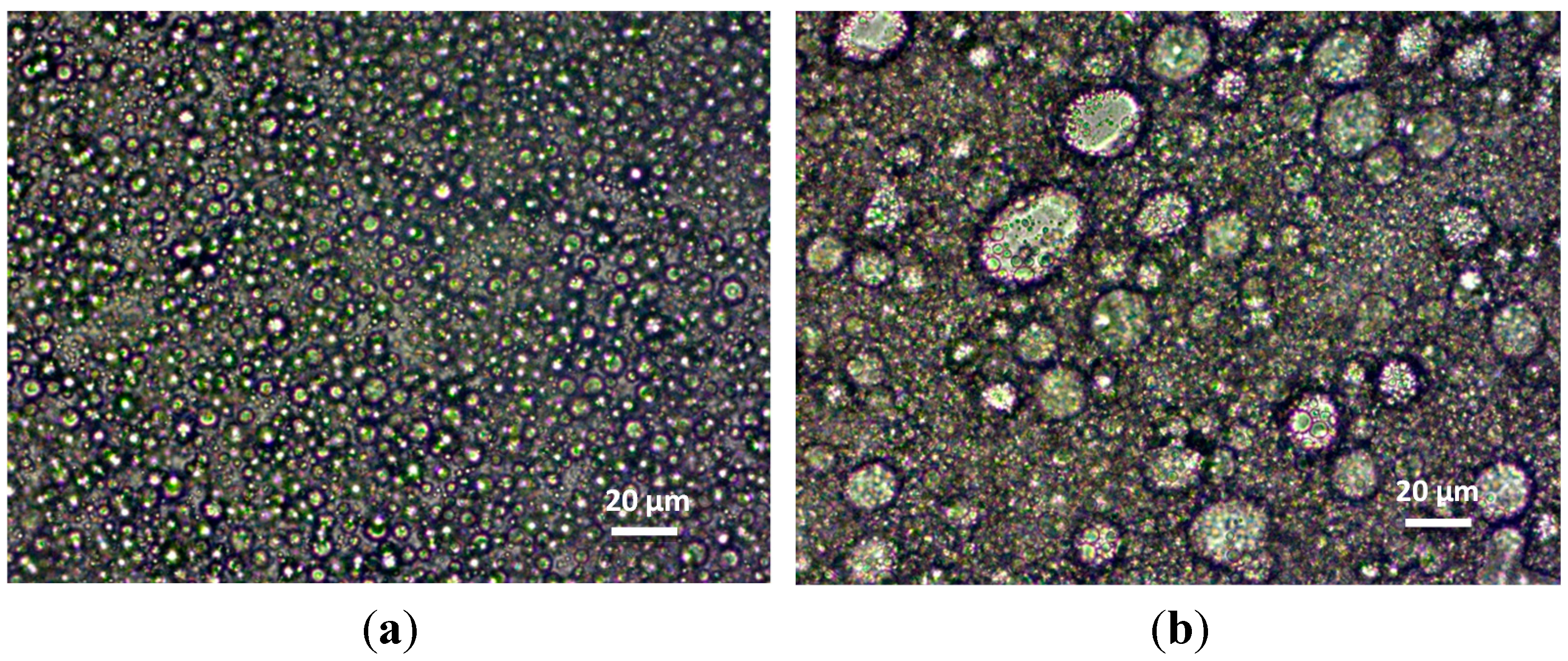 Morphology of the emulsions E6 (a) and E7 (b) observed under optical microscope.