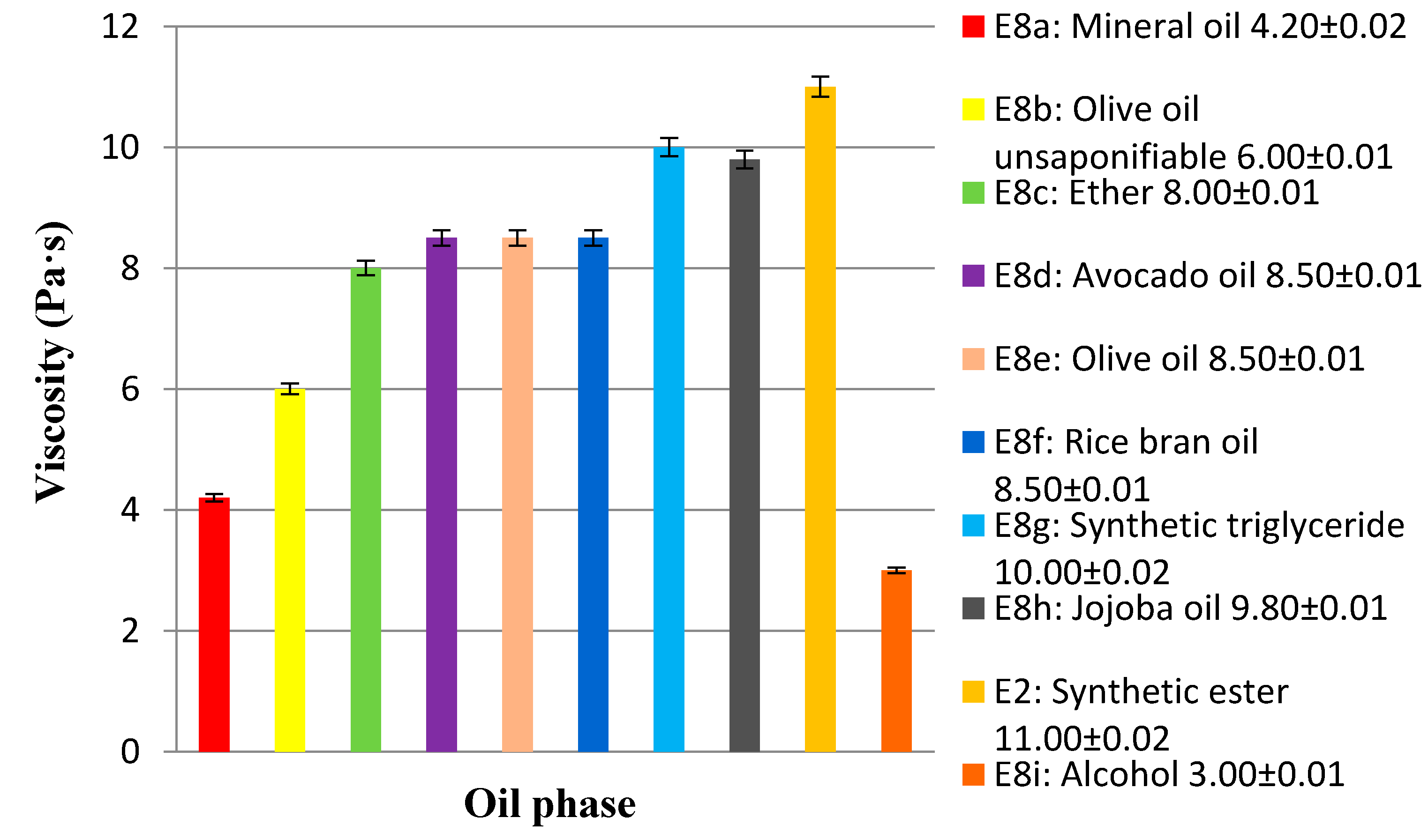 All these emulsions have passed the test of stability except those prepared with Octyldodecanol (E8i) and mineral oil (E8a). The results obtained highlighted the higher affinity of the emulsifier to the moderately polar oils (ethers, triglycerides, esters). Also in these case, the type of oil phase affects the viscosity of the system (