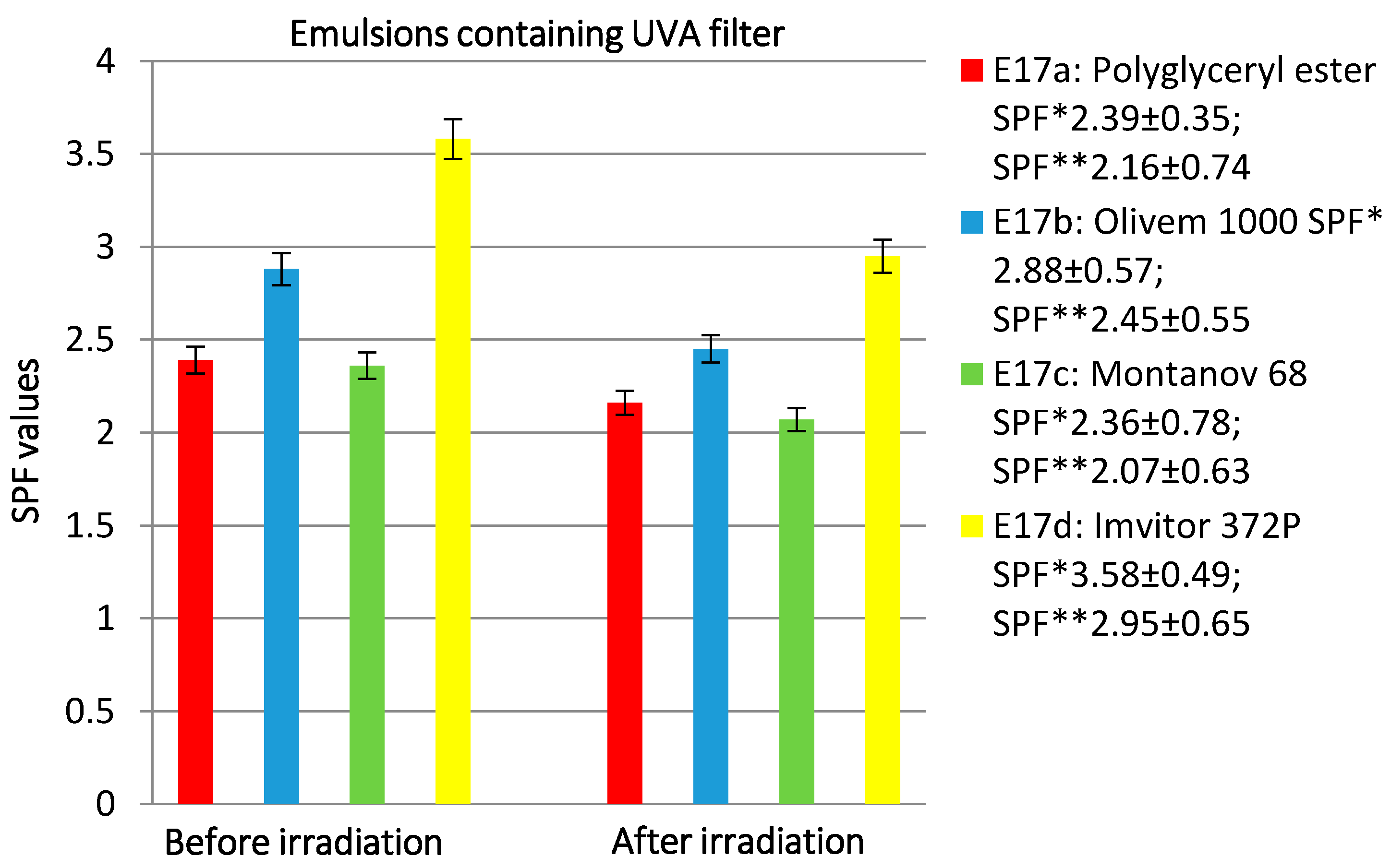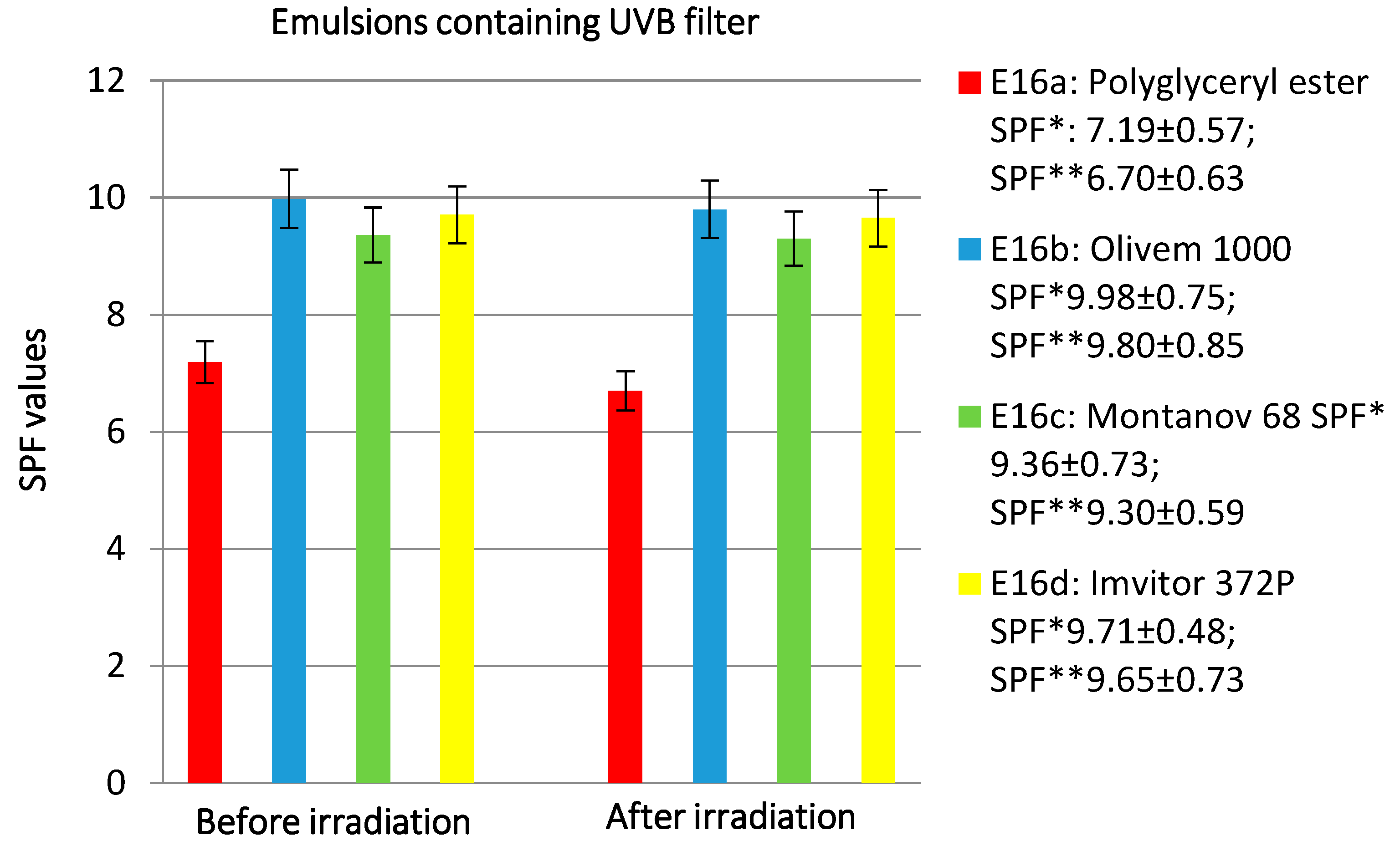 Figure 9, the emulsion prepared with the polyglycerol esters has an SPF value comparable to that of the emulsion obtained with the glucoside derivative (Montanov 68) but provides better photostability. The decrease of SPF value is higher for the emulsion prepared with Imvitor 372P (17.60%), followed by Olivem 1000 (14.93%), Montanov 68 (12.28%), and Polyglycerol esters (9.62%).