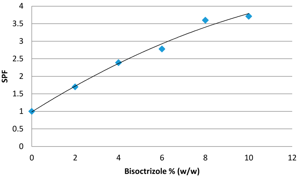 Bisoctrizole or 2,2'-methylene-bis-(6(2H-benotriazol-2-yl)-4-(1,1,3,3-tetramethylbutyl)phenol) (CAS No 103597-45-1) (Tinosorb® M, BASF, Ludwigshafen, Germany) is a hydrophilic filter—which is an advantage as the vast majority of UV filters available are lipophilic-, broad spectrum, and launched onto the market in the late 1990s. Its maximum dose of use is fixed at 10% (w/w). At this percentage, high levels of protection in the UVB region cannot be obtained (Figure 1). It is considered as a mediocre filter as it does not enable one SPF unit per percentage of use to be obtained, as is the case, for example, with ethylhexylmethoxycinnamate.