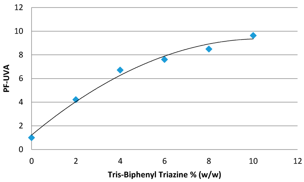 Tris-Biphenyl Triazine or 1,3,5-Triazine, 2,4,6-tris[1,1'-biphenyl]-4-yl (Tinosorb® A2B, BASF) is a substance which is now on Appendix VI of Regulation (EC) No 1223/2009 [12]. This hydrodispersible filter presents a remarkable level of efficacy in both the UVA (Figure 3) and UVB (Figure 4) range [43].
