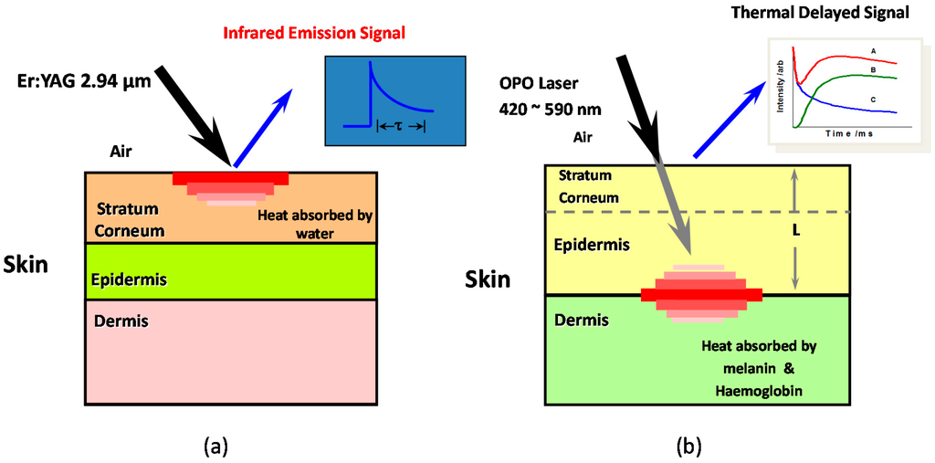 When the Er:YAG laser (2.94 µm wavelength, 100 ns pulse width, a few mille joules per pulse) is used as the heat source, see Figure 1a, the laser is absorbed at the skin surface, by the water in the skin, and the measurements are confined within stratum corneum, the outmost skin layer (~20 µm in thickness). In this case, OTTER signal is typically a decay signal, and depending on the detection wavelength, the OTTER signals can either reflect the water concentration information in skin (13.1 µm), or solvent concentration information within skin (9.5 µm). By applying different mathematical models, we can get the average water content in stratum corneum [10], the water concentration gradient in stratum corneum [10,15], and water concentration depth profiles or solvent concentration depth profiles in stratum corneum [16].