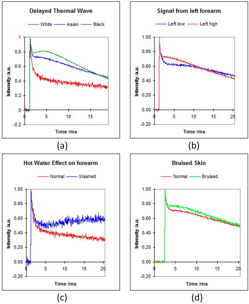 The OTTER signals of different types of skin (a); different position on forearm (b); hot water effect (c); and bruised skin (d) [10].