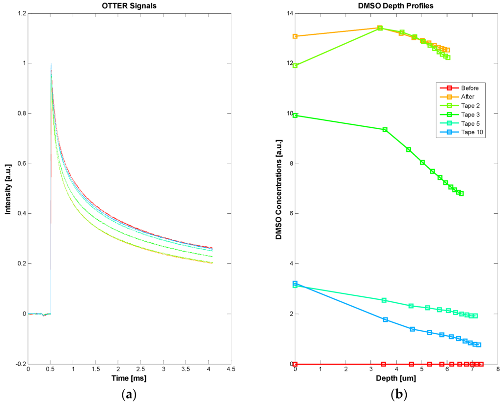 By selecting detection wavelength at 9.5 µm, where water has relatively low absorption and chemical solvents have relatively high absorption, we can also measure the solvent penetration through the skin [16,17,23,24]. Figure 6 shows the OTTER results of Dimethyl sulfoxide (DMSO) penetration through skin. In this measurement, a small amount of undiluted DMSO solvent (~0.1 mL) is applied on a test skin site for 5 min. After the skin surface is wiped dry, tape stripping is performed, in order to see how much and how deep the DMSO penetrates. OTTER measurements are performed, both before and after the DMSO solvent application, and after each tape stripping, with a total of 10 tape strips applied. Figure 6 shows the OTTER signals (a), and the corresponding DMSO concentration depth profiles using SLS fitting technique at different tape stripping (b). The results show a high DMSO concentration immediately after its application, and then as tape stripping continued, deep into the skin, DMSO concentration gradually reduced. Other solvents that have been studied include propylene glycol, ethylene glycol, glycerol, alcohol, decanol, butyl acetate, etc. [23,24]. OTTER can work well on both in vivo and in vitro skin samples.