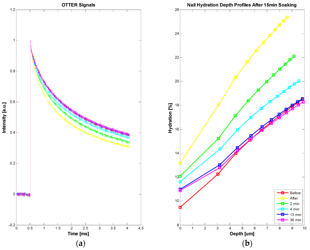 Apart from in vivo and in vitro skin samples, OTTER can also work on nails, for both water content measurements and solvent penetration measurements [24,25]. Figure 7 shows the OTTER signals of human fingernail (a) and corresponding water concentration depth profiles before and after a 15 min soaking in water (b). In this experiment, a left hand nail was soaked in room temperature water for 15 min, then carefully patted dry. The OTTER measurements were performed both before and after soaking. The nail water concentration has increased after the soaking, indicating absorbing of water through soaking, and then as nail recovered in ambient condition, the nail water concentration gradually reduced to the normal level.