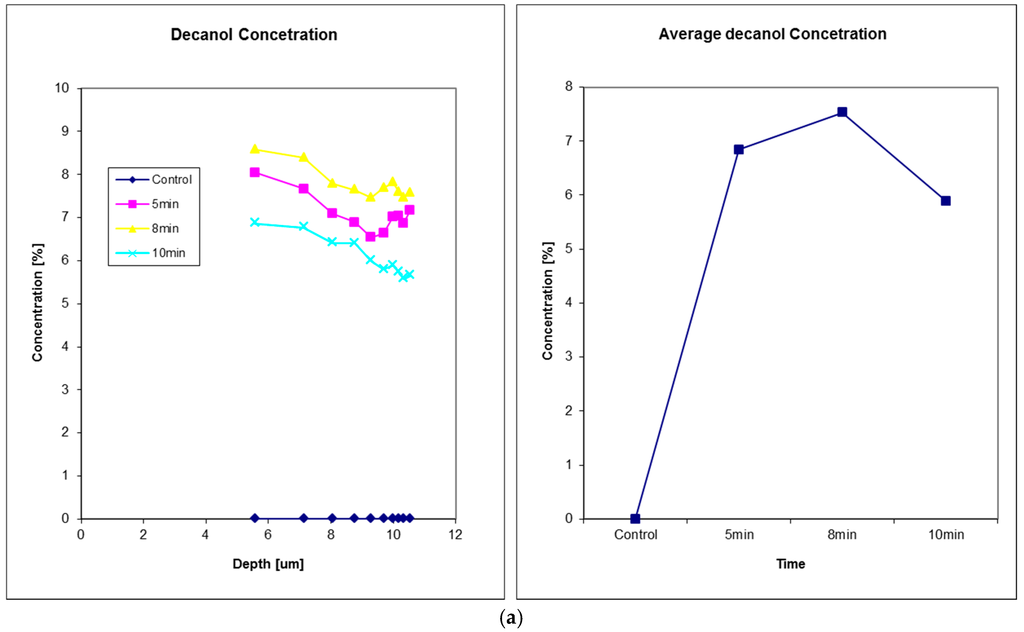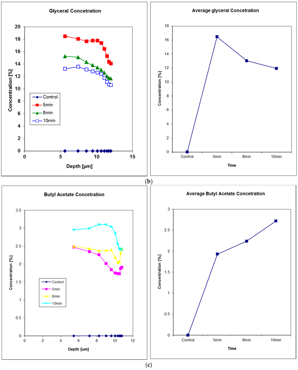 Figure 8 shows the solvent penetration through nail measurements, data from Reference [24]. In this experiment, three solvents were studied, glycerol, decanol, and butyl acetate. Solvents were applied to the fingernail of a volunteer using a filter pad (Cat. No. 1001 110, Whatman, Kent, UK) for a period of 5 min. The pad was then removed, the nail wiped ,and the solvent decay measured on removal and then at 8 and 10 min after the initial application. Glycerol exhibits the fastest diffusion through nail tissue of the three solvents tested, as after 5 min the concentration profile immediately starts to decrease.