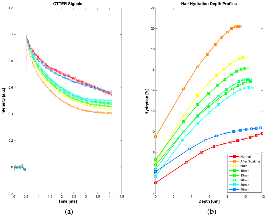 Our latest study shows that OTTER can also be used for hair measurements, despite of low water content in the hair. Figure 9 shows the hair water content measurements. In this experiment, an ex vivo hair sample, freshly cut from a healthy volunteer, was hydrated by soaking in room temperature water for 15 min, then patted dry afterwards. The OTTER measurements were performed both before and periodically after the soaking. As explained earlier, in Figure 4, the curved feature of hair hydration depth profile is likely due to the layered hair structure. It is interesting to point out that, immediately after soaking, this curved feature seems to disappear, which might suggest excess water absorbed during soaking has gone into different layers in hair. It is also interesting to point out that it takes more than 40 min for hair to recover to its normal hydration level, this is slower than the skin and the nail in our previous studies [10,26]. Additionally, as hair gradually loses its excess water to the ambient environment, the curved feature of the hair hydration depth profile started to re-appear.