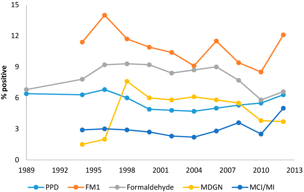As noted elsewhere in this issue, fragrances, hair dyes and preservatives are the most common skin sensitizing chemicals associated with the induction of contact allergy and the causation of ACD to cosmetic products []. Consequently, they provide useful markers for the prevalence of cosmetic allergy, since several of these have been tested routinely over a few decades. For example, the North American Contact Dermatitis Group (NACDG) has been reporting collated diagnostic patch test results for many years [,,,,,]. From this can be abstracted information such as that shown in Figure 1, which displays the overall incidence of contact allergy to three preservatives, the standard fragrance mix (FM1) and the main sensitizing hair dye ingredient, p-phenylenediamine (PPD). Each of these five contact allergy markers, all used in cosmetics, show variation over the approximately quarter century period covered, but they do not indicate any general downward trend. It might be reasonable to expect that since the QRA approach was developed specifically to assist with the high level of fragrance allergy, then this source of contact allergy should be on the decline. However, the prevalence of contact allergy to FM1 remained about 11% ± 2% over the testing period shown.