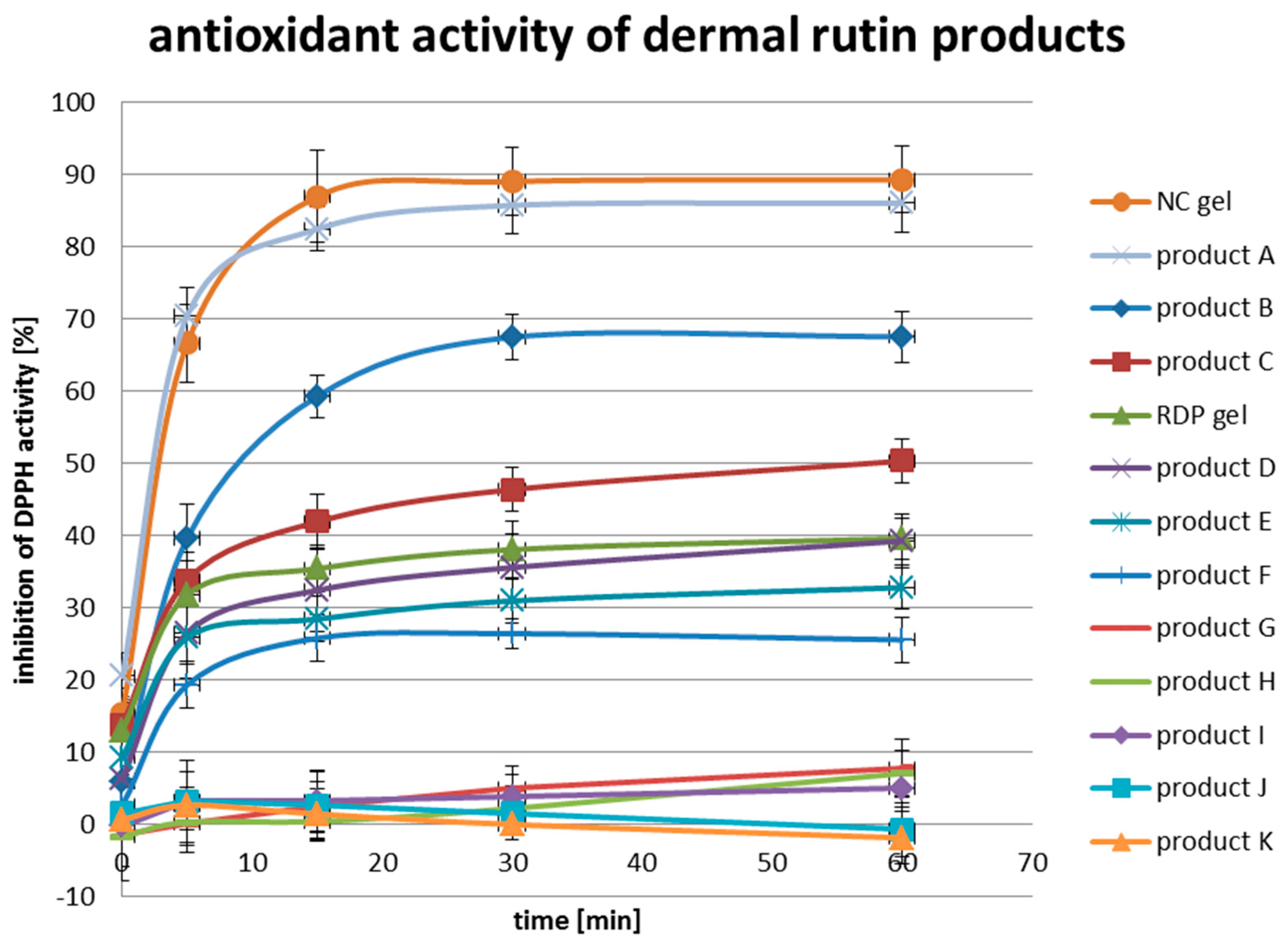 Even more interesting was the finding that there are also no clear relationships between the type of incorporated rutin and the antioxidant activity of the product exhibited. For example, rutin raw drug powder was the active agent in both product E and G. Product E was able to neutralize more than 30% of the DPPH radicals, while G could not even inhibit 10% of the DPPH radical activity. The same pattern was observed for the products C and D and H, I, and K. All five products have disodium rutinyl disulfate incorporated, but only product C and D showed inhibition effects on DPPH of 50% and 40%, respectively. In contrast, the products H, I and K had nearly no neutralizing effect on the free radical DPPH. The highest antioxidant activity among the products was obtained for product A. It showed almost the same curve progression as the nanocrystal gel. By reading through the advertisement of the company, it was found that this product has rutin incorporated as nanocrystal as well.
