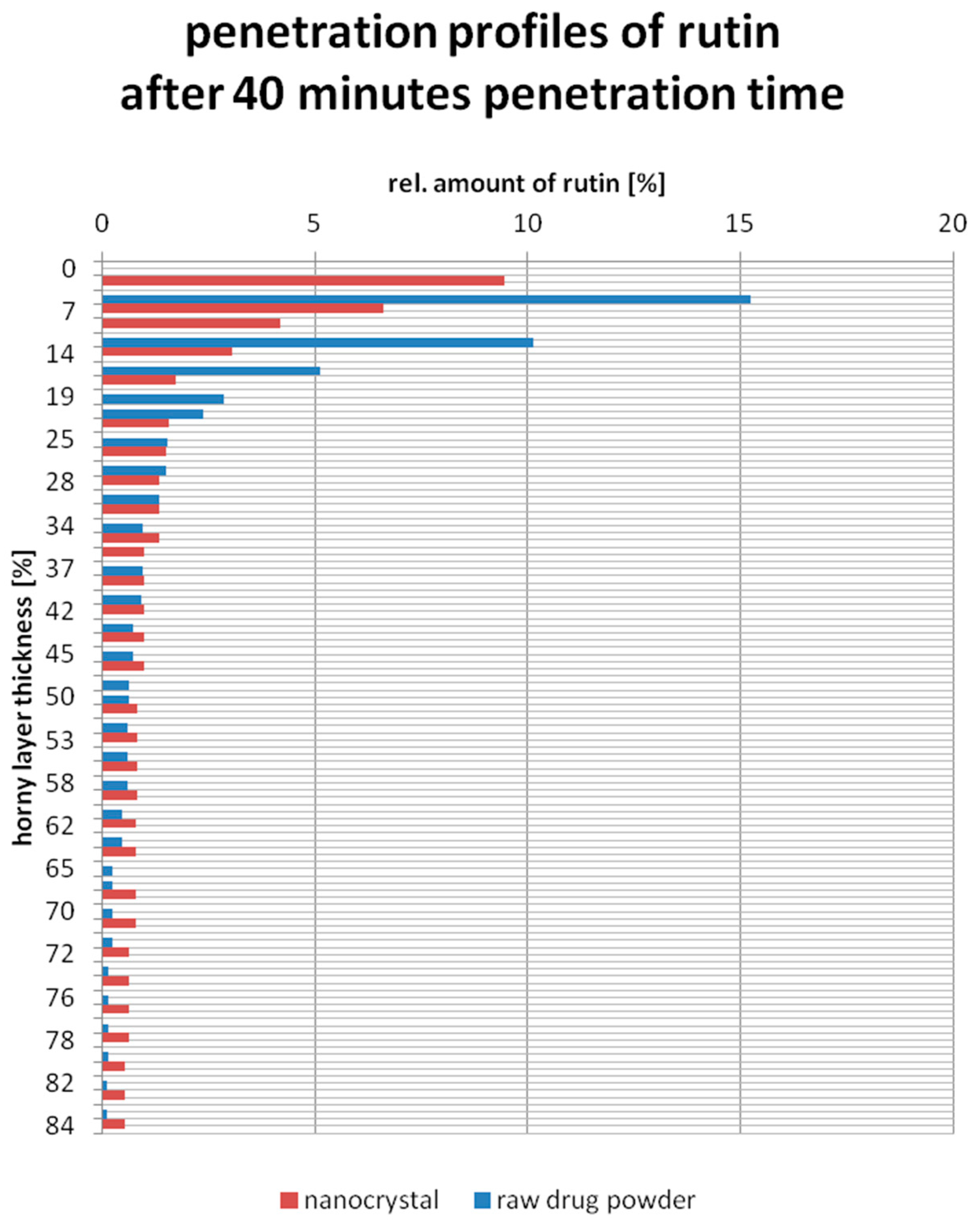 No difference in penetration depth was investigated between both formulations since the used 30 tapes only removed approximately 84% [16] of the whole stratum corneum. However, the course of the penetration curve suggests that the penetration depth would have been deeper for the rutin nanocrystal gel.