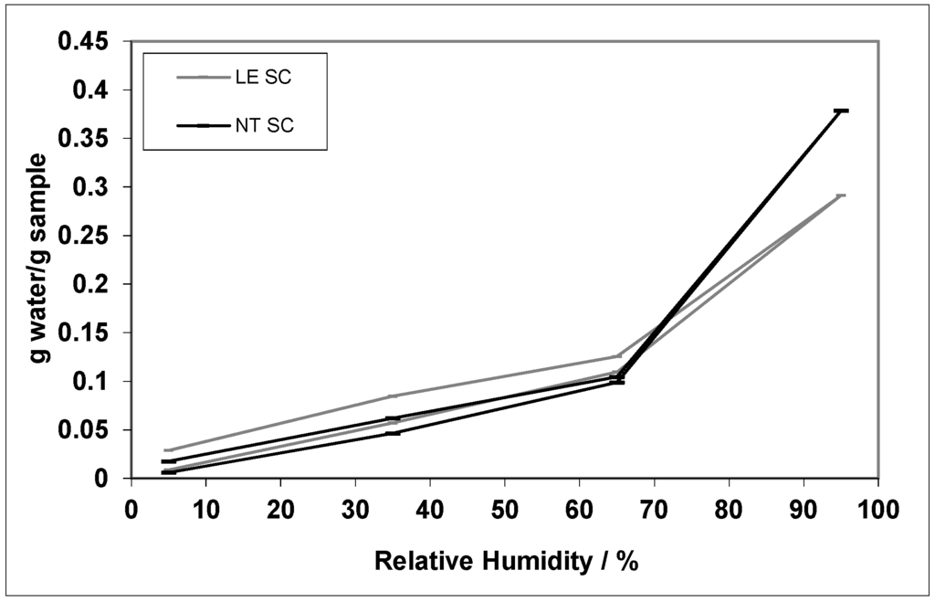 Water sorption isotherms for non-treated SC (NT SC) and lipid-extracted SC (LE SC).