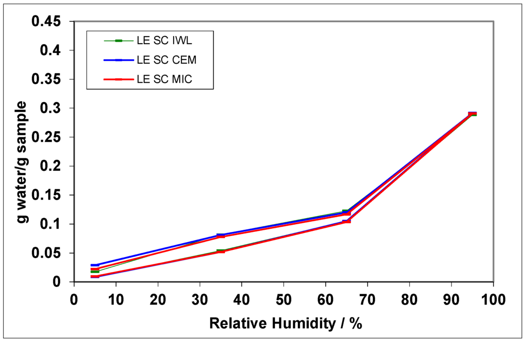 Water sorption isotherms for lipid-extracted stratum corneum (SC) treated with the ceramide containing samples (internal wool lipids, LE SC IWL; ceramide emulsion, LE SC CEM; and microceramides, LE SC MIC).