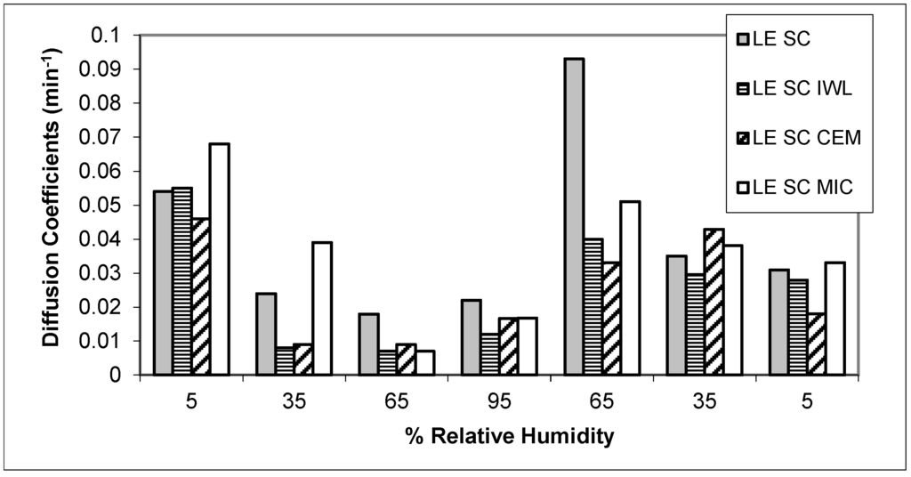The SC was isolated from fresh pigs’ backs and was treated with organic solvents in order to extract the SC lipids according to the procedure described in the previous section (LE SC). In an earlier study, the effect of the lipid extraction from the SC sample was demonstrated [42]. When the lipids were extracted, there was a clear decrease in the SC water content. This decreased capacity to absorb water was observed for the LE SC at all the humidity steps evaluated. Furthermore, when the SC was damaged by the treatment with the organic solvents there was a significant increase in the SC’s permeability, as demonstrated by a substantial increase in the values of the diffusions coefficients [40].