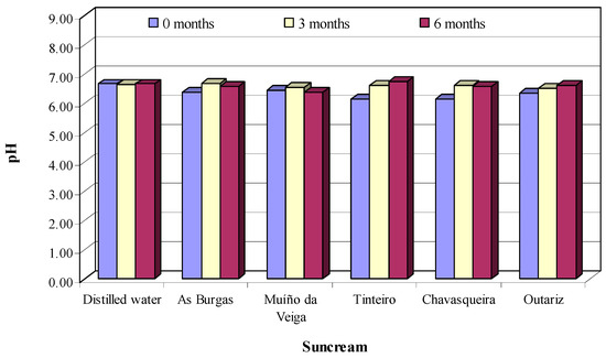 The pH values of the sun creams remained stable between 6.16 and 6.75 after six months (Figure 1). No significant differences (p < 0.05) were observed among the creams formulated with different thermal waters or among each product along the studied time. The value in the control cream remained almost constant during the studied storage period, with values of 6.66–6.67. However, the creams formulated with thermal waters showed an increase in the pH value after three months of storage. The highest, but non-significant, change was observed in creams prepared with Tinteiro and A Chavasqueira waters, which showed a 10% increase of pH values in this period. Except for Burgas after three months and Tinteiro after six months, all creams elaborated from mineral waters presented a lower pH than distilled water.