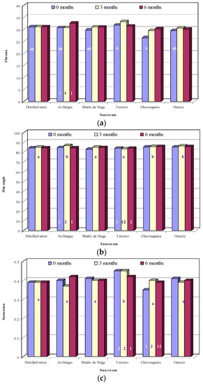 The saturation is shown in Figure 3c. Only in the creams prepared with Tinteiro and A Chavasqueira waters the chromatic saturation show significant variations (p < 0.05) with the storage time. This parameter, also named purity, refers to the intensity and it could be observed that the cream formulated with Tinteiro water lost intensity and that formulated with A Chavasqueira water, increased intensity. Saturation values are similar for all creams, except for that prepared with Tinteiro water, which showed the highest saturation at the three times evaluated.
