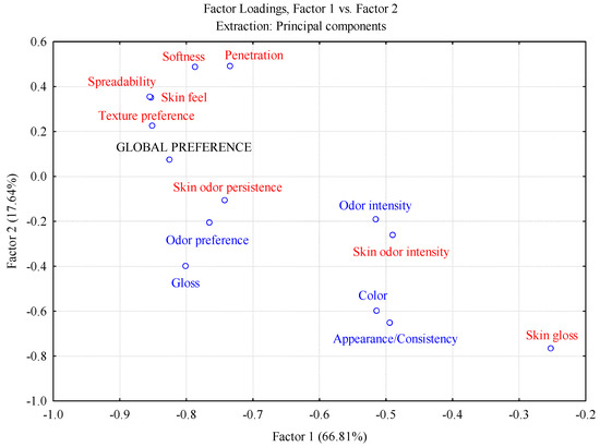 The Principal Component Analysis (PCA) of the sensory attributes accounted for 84.45% of the variability. The main variance is explained by Factor 1 (66.81%) and Factor 2 (17.64%). The loading plot of the sensory variables presented in Figure 5 showed that the overall preference of the sun creams was significantly related to the textural characteristics (spreadability, penetration, softness, and skin feel) [55] and to the persistence of the odor in the skin [56].