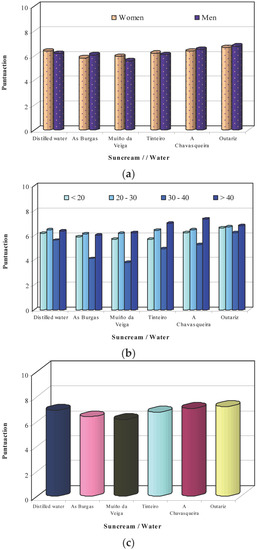 With respect to the thermal water employed in the elaboration of the sun creams (Figure 6), the evaluation of volunteers of different sex and age showed that there were no large differences between the scores given by men compared to those granted by women (Figure 6a), the creams formulated with Muíño da Veiga water showing more disparity of opinion. Men scored better emulsions prepared with the waters of Outariz, A Chavasqueira, and As Burgas. Volunteers between 30 and 40 provided a more accurate distinction among the creams, with more than two points of difference between sun creams elaborated with Muíño da Veiga and Outariz waters (Figure 6b).