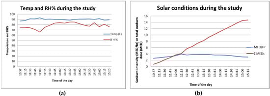Environmental measures at beach. (a) Temperature and relative humidity during the study; (b) Solar conditions during the study. Blue line shows measured UV intensity (MED/h) and red line shows cumulative erythemal dose throughout the study.