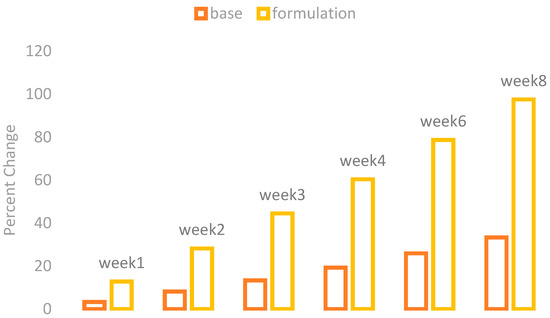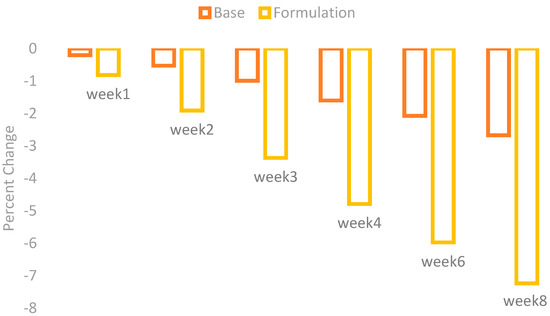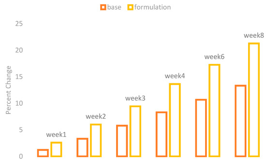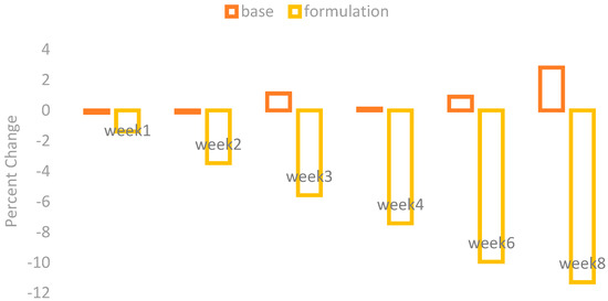 The melanin values of the skin of the cheeks were measured by using a Mexameter MX 18 (Courage + Khazaka, Cologne, Germany). These values were measured on the first day before the application of base and formulation and then on Weeks 1, 2, 3, 4, 6, and 8. The percentage changes in the skin melanin after the application of base and formulation are given in Figure 1.