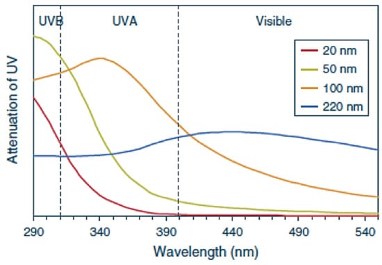Titanium dioxide and zinc oxide are especially used in their ‘nano-sized’ form for many reasons. The nanosize dimension enhances the protection capacity [32]. Moreover, the smaller the particles, the higher the homogeneity of the layer onto the skin, the better the coverage of the epidermis. Finally, for particle size of about 35 nm, nanoparticles are big enough to absorb, scatter and reflect short-wavelength UV radiation while they keep invisible to the longer-wavelength, visible light. In this way, the sunscreen formulation is transparent to the eyes. The optimum particle size for high UVB and UVA attenuation but good transparency is between 40 nm and 60 nm [33] (see Figure 3).
